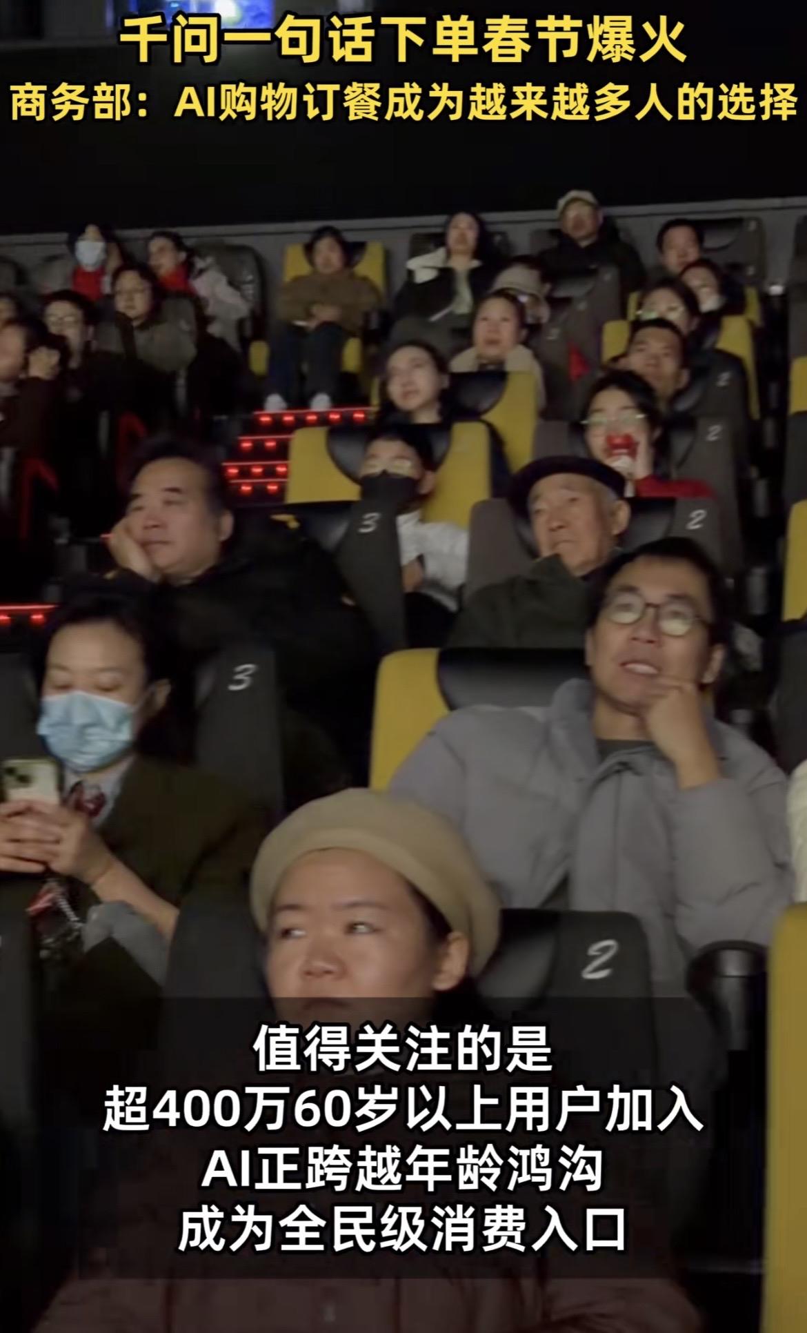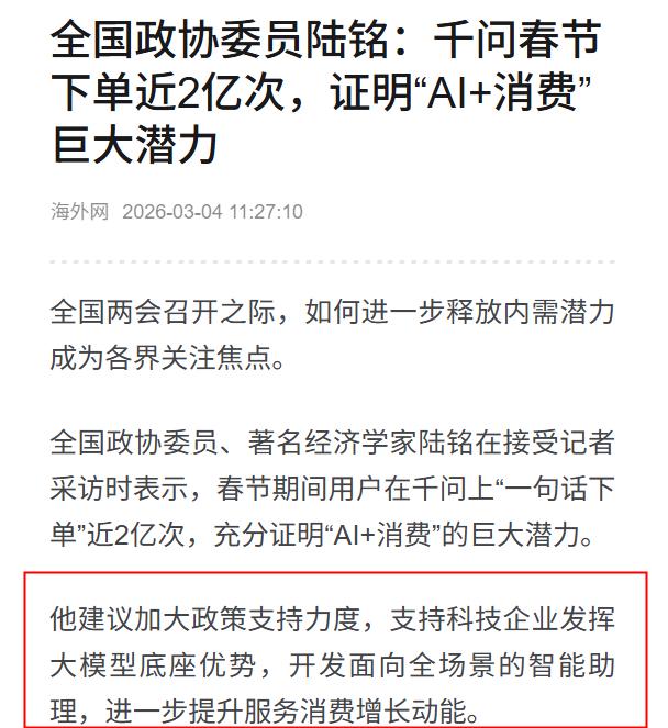 大家发现没有,一个新的变化正在中国发生,事关AI和消费! 最近进入两会周期,最新政府工作报告里最大的亮点就是AI了,“AI”引发了大家热议。 全国政协委员陆铭接受采访时说的一句话挺值得关注,他说春节期间用户在千问上“一句话下单”近2亿次,充分证明了“AI+消费”的巨大潜力。 要知道最近进入两会周期,AI大篇幅写入最新的政府工作报告,“AI”引发了大家热议。 同时他还建议加大政策支持力度,支持科技企业发挥大模型的优势,进一步提升服务消费增长动能。 有一说一,这个建议很好,因为在AI消费应用上中国其实已经在领跑全球,有了先发优势。 这一点从千问春节活动就能看出,通过AI+消费的形式,活动上线仅9个小时,用户在千问APP上的AI订单就突破了1000万单。仅仅3个月时间,千问日活就达到了7352万,这样的速度,怕是也只有在中国能做到。 而且我们会发现,AI消费的出现也带来了新的生产力,让消费变得更加高效,地域人群限制变得更小。 以前咱们买东西,需要主动去搜索寻找商品,相对比较繁琐,而现在AI时代下,打开千问只需一句话,AI就会自动下单“帮我买”,把事直接办妥。 同时地域和人群的限制也在缩小,千问数据就提到,春节期间,有超过400万60岁以上的用户让千问帮忙下单,打破了数字鸿沟。 同时还有半数订单来自县城,第一波城市和县域用户消费得到进一步释放。 换句话说,AI+消费已经在中国展现出其强大的拉动内需潜力,对于咱们而言,当下要做的就是大力发展AI+消费,将其打造成中国AI发展的新范式。成为中国全球AI竞争中,一把新的“利刃”!