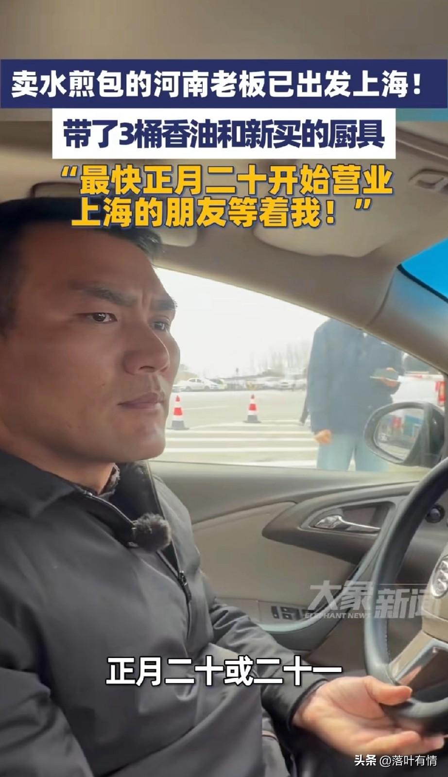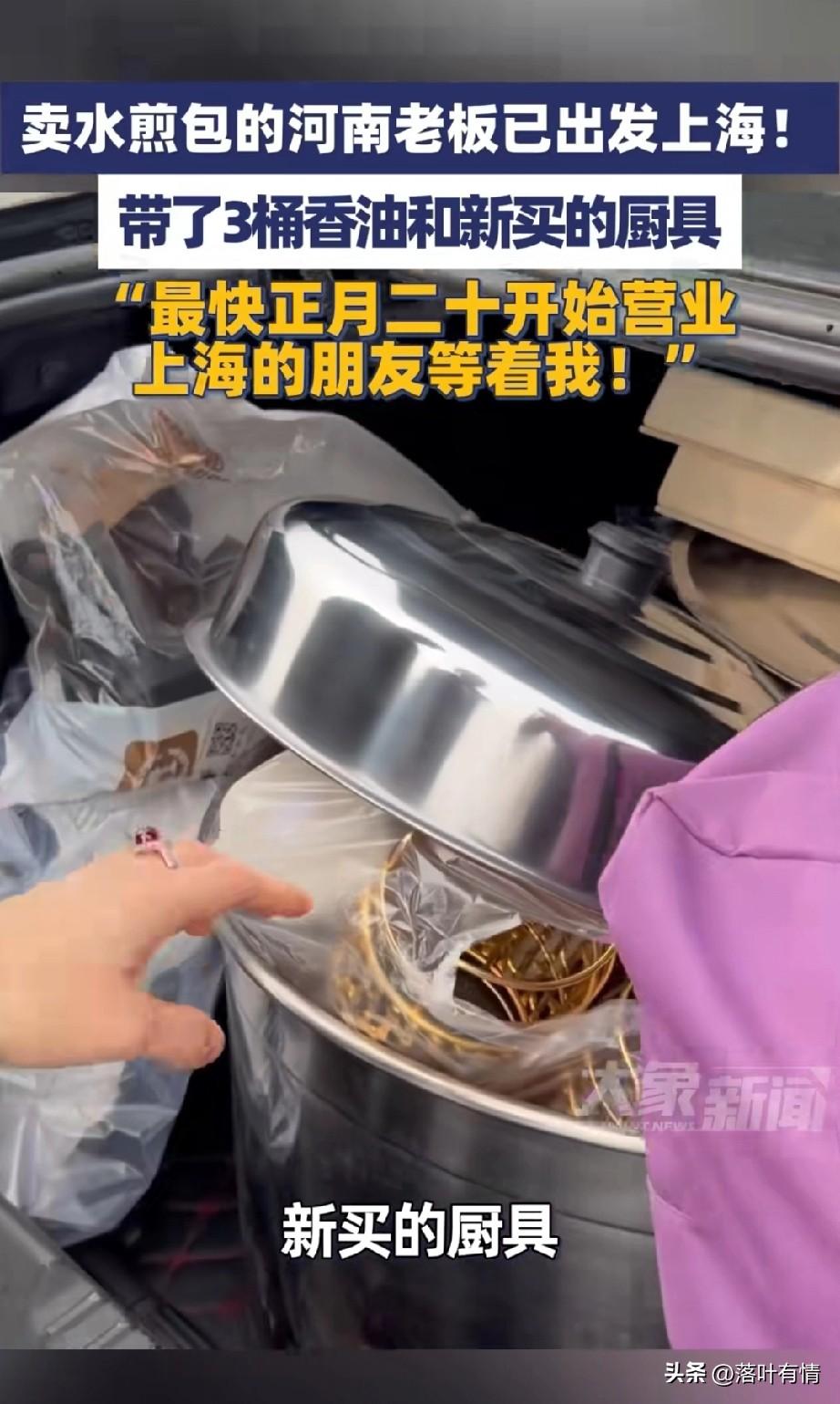 上海的网友不要催了, 河南商丘卖水煎包的大哥已经出发了, 大哥走的时候带了很多材料, 还带了家里炸的大壶香油, 可以说后备箱都塞满, 出发前特地给大家拍了个视频, 告诉上海的朋友,不要着急, 正月二十肯定准时开门, 一定让大家吃上热腾腾的水煎包, 还有好喝的胡辣汤, 毕竟他已经做了好几年了, 手艺没得说, 可以说是物美价廉, 在上海那样的地方居然还有三块的胡辣汤,简直让人很羡慕, 河南很多地区现在都只有5块的了, 不过包子和各种粥卖的真便宜, 感觉不像上海的物价, 大哥,要不要考虑涨涨价?