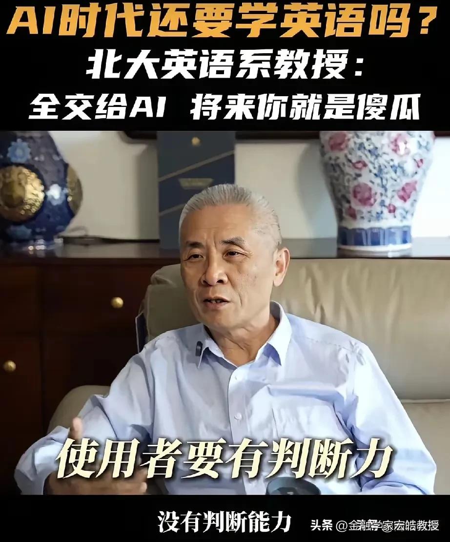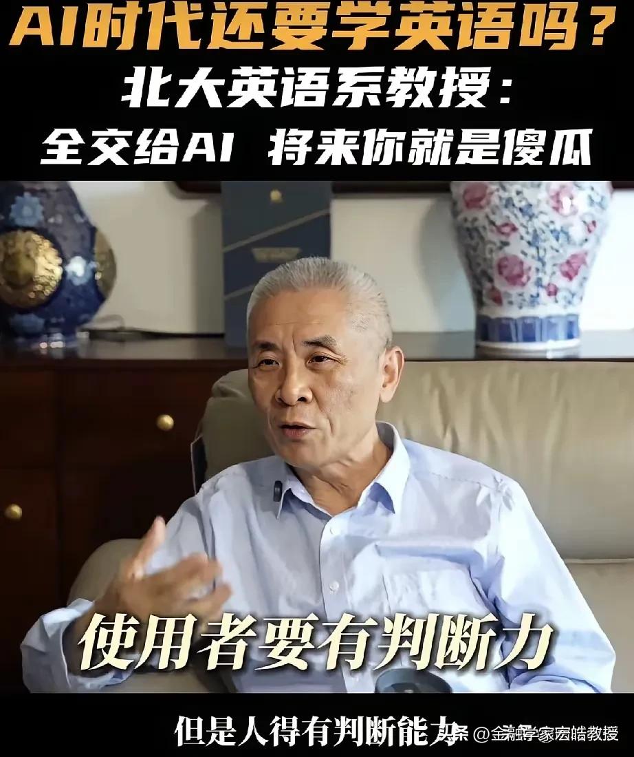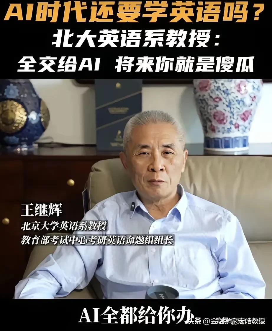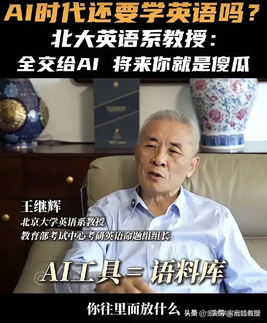 AI时代还要不要学不学英语?北大教授一句话点醒了多少人! “全交给AI,将来你就是傻瓜!”北大英语系教授王继辉的这番话,直接戳破了当下的一个误区。他强调,AI只是语料库,使用者必须有判断力,言下之意就是AI不一定全对,否则只会沦为没有思考能力的机器使用者。 这并非反对取消英语考试,而是提醒我们:英语是工具,AI也是工具。今年两会,政协委员洪明基就提出建议,将英语高考分数降至100分,注重听说能力考察,弱化较难语法,且一年考两次取最高分,本质上也是回归工具属性,而非彻底放弃。 说到底,真正的核心,是用AI辅助学习,而非让它替代思考。毕竟,能被机器取代的,从来都不是语言本身,而是缺乏独立判断的人。天南地北大拜年