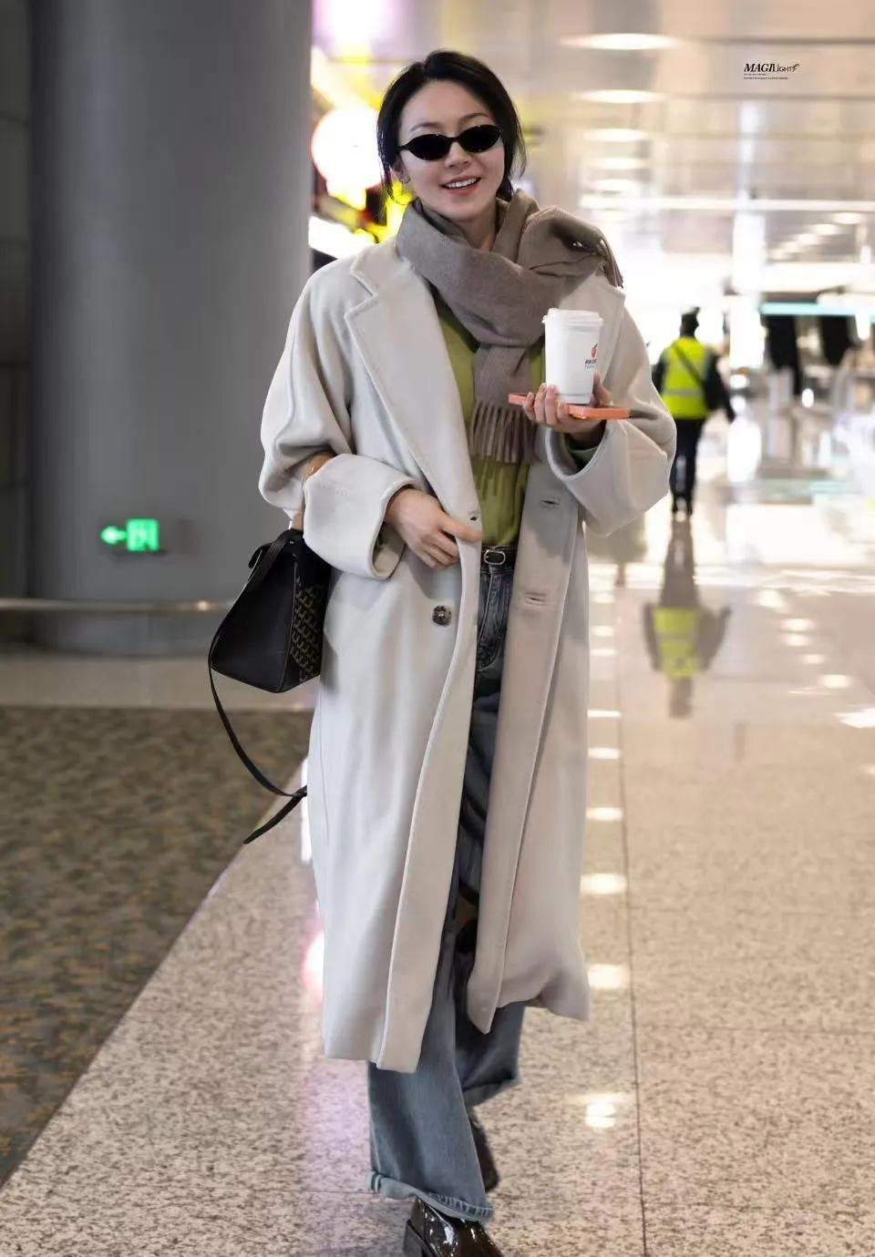 黄梦莹机场封神!奶油白大衣配牛油果绿打底,这配色太懂冬日氛围感了✨ 黄梦莹 明星私服 冬日穿搭