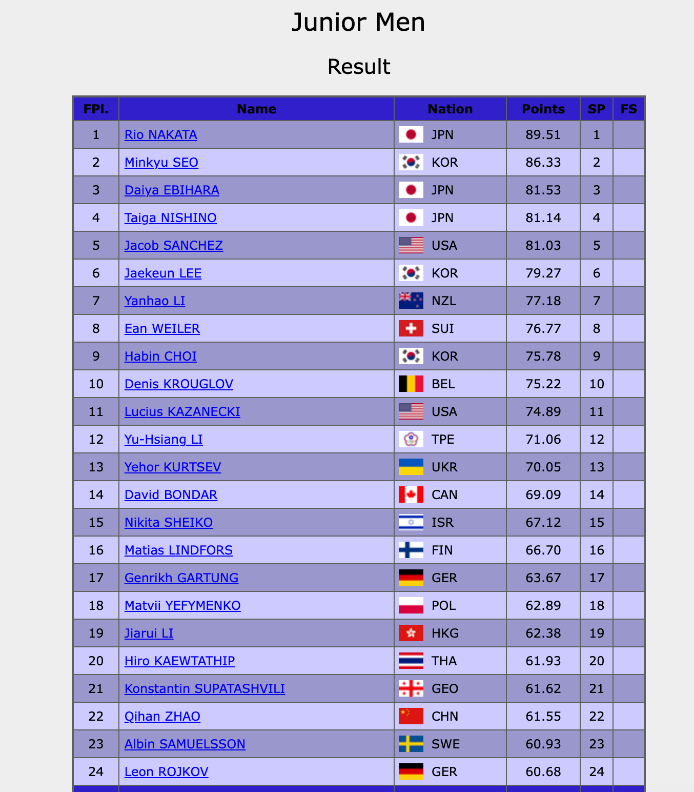 虎扑03月05日讯3月4日,国际滑联世界青年花样滑冰锦标赛结束了男子单人滑短节目的比拼。中国选手赵启涵滑出61.55分位列第22名,中国香港选手李嘉锐滑出62.38分位列第19名,日本选手中田璃士滑出89.51分位列短节目榜首。
