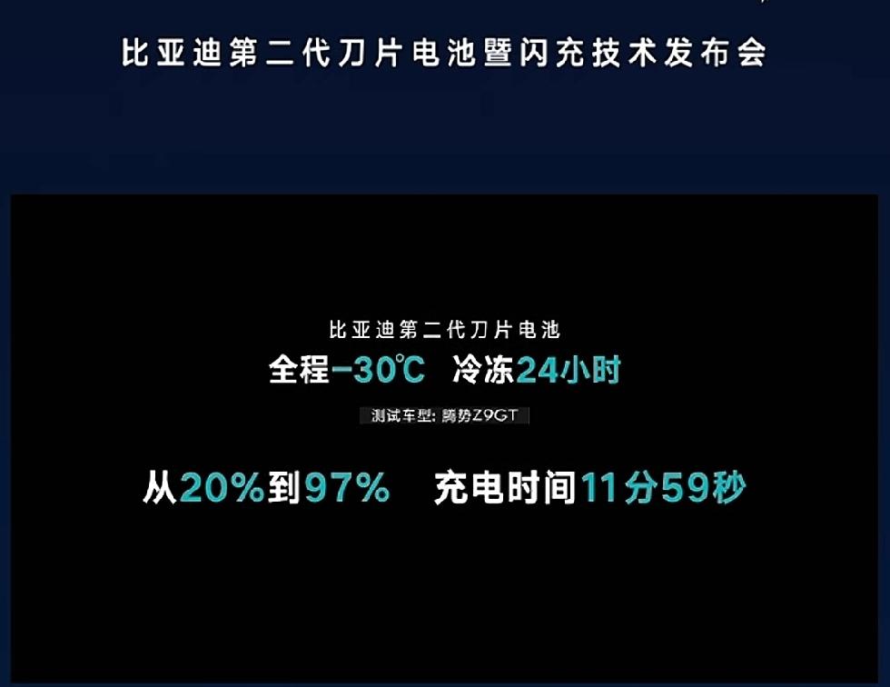 比亚迪第二代刀片电池,具备闪充功能,能量密度不仅没有降低,反而有所提升。 5分钟就能充到一定电量,9分钟便可充饱。在零下30度的环境下冷冻24小时后,从20%充到97%仅需12分钟。 这并非简单的技术积累,而是一场技术颠覆。比亚迪的常温闪充,将充电时间锁定在10分钟以内,这无疑是一场新的技术革命。10分钟的充电时间,你还会有充电顾虑吗?选择新能源,阻力是否就此消除了呢? 在安全方面,热量实现了并联导热,能在毫秒级进行处理,对电池寿命毫无影响。
