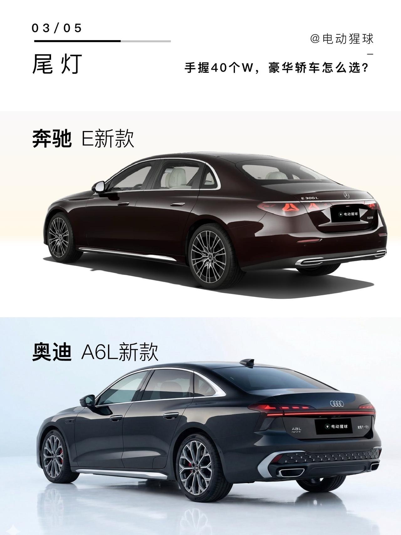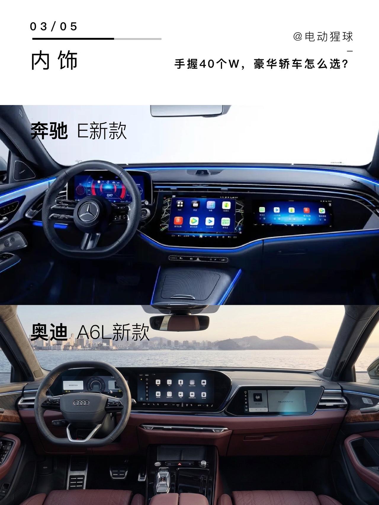 手握40个W,豪华轿车怎么选?奥迪A6L终于完成换代,外观大改,内饰换上了双联屏和副驾屏,飞机档把改为了电子换挡。对上刚刚换代的奔驰E,经典的花生灯回归,内饰同样改成全是屏幕,手握40个W,你会怎么选?奥迪A6L 奔驰E