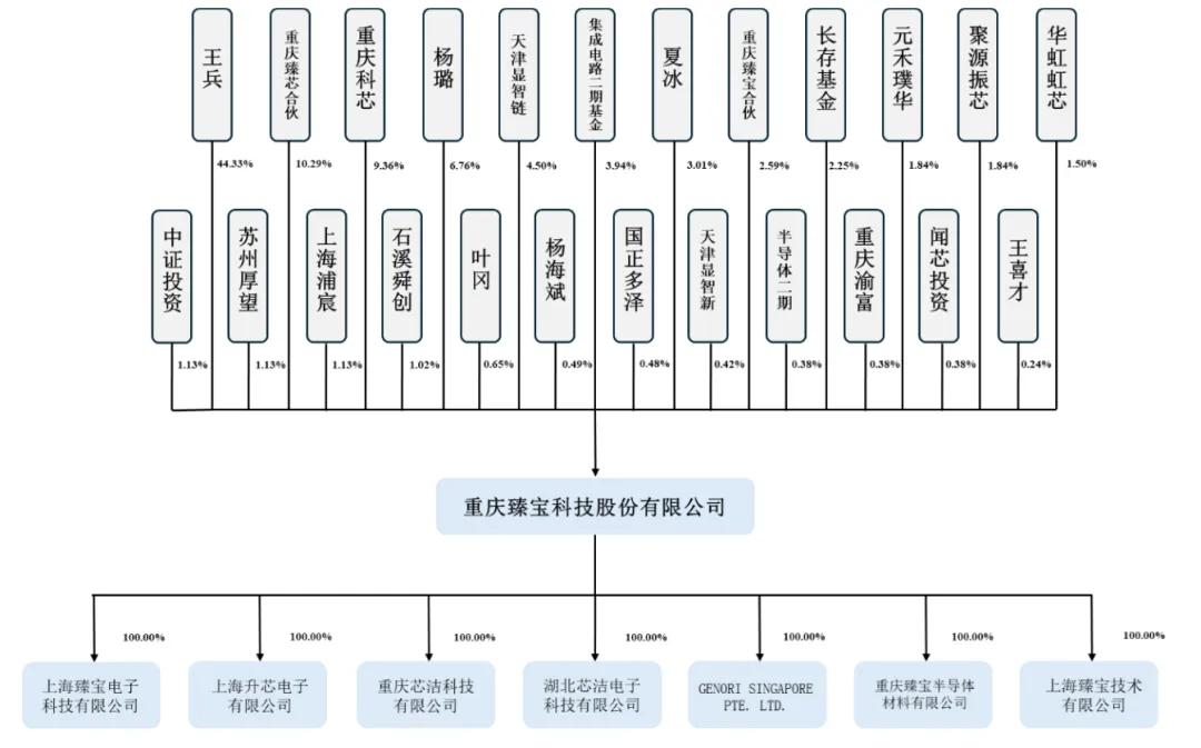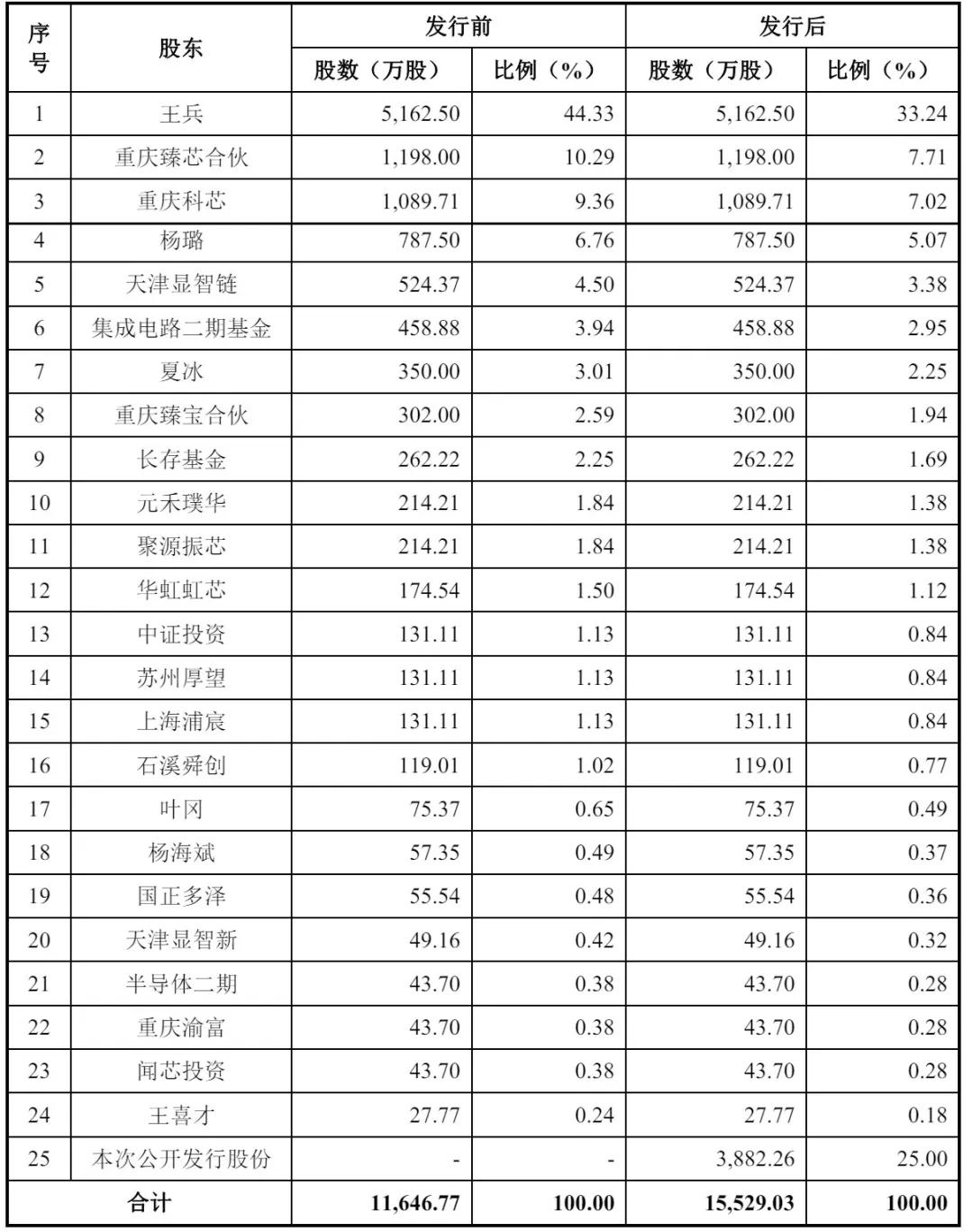 其中,王兵持股33.24%,重庆臻芯合伙持股7.71%,重庆科芯持股为7.02%,杨璐持股5.07%,天津显智链持股3.38%,集成电路二期基金持股为2.95%,夏冰持股2.25%,重庆臻宝合伙持股为1.94%,长存基金持股为1.69%,元禾璞华、聚源振芯分别持股为1.38%,华虹虹芯持股为1.12%;