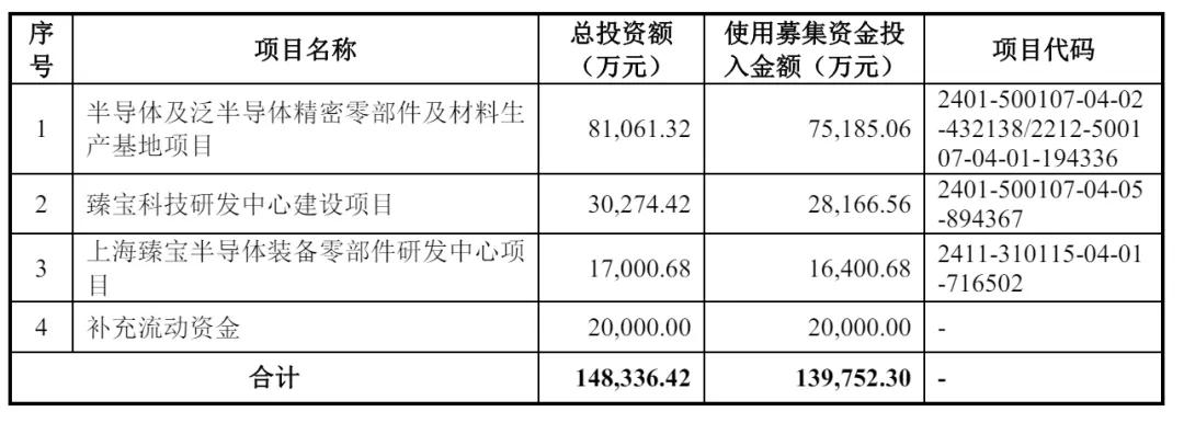 臻宝科技计划募资14亿,其中,7.52亿用于半导体及泛半导体精密零部件及材料生产基地项目,2.82亿用于臻宝科技研发中心建设项目,1.64亿用于上海臻宝半导体装备零部件研发中心项目,2亿用于补充流动资金。