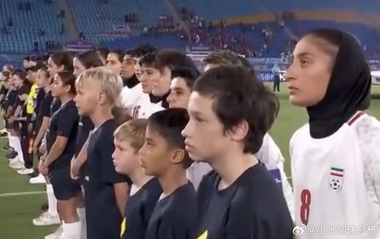 今天的比赛前,现场按照惯例举行了奏唱国歌的仪式。当伊朗国歌响起的时候,戴着头巾的伊朗女足球员全部高唱国歌,有的人深情闭眼,有的人则看向远方,似乎是在想念遥远的祖国。此外,伊朗女足球员在唱国歌时还做出了行军礼的动作。