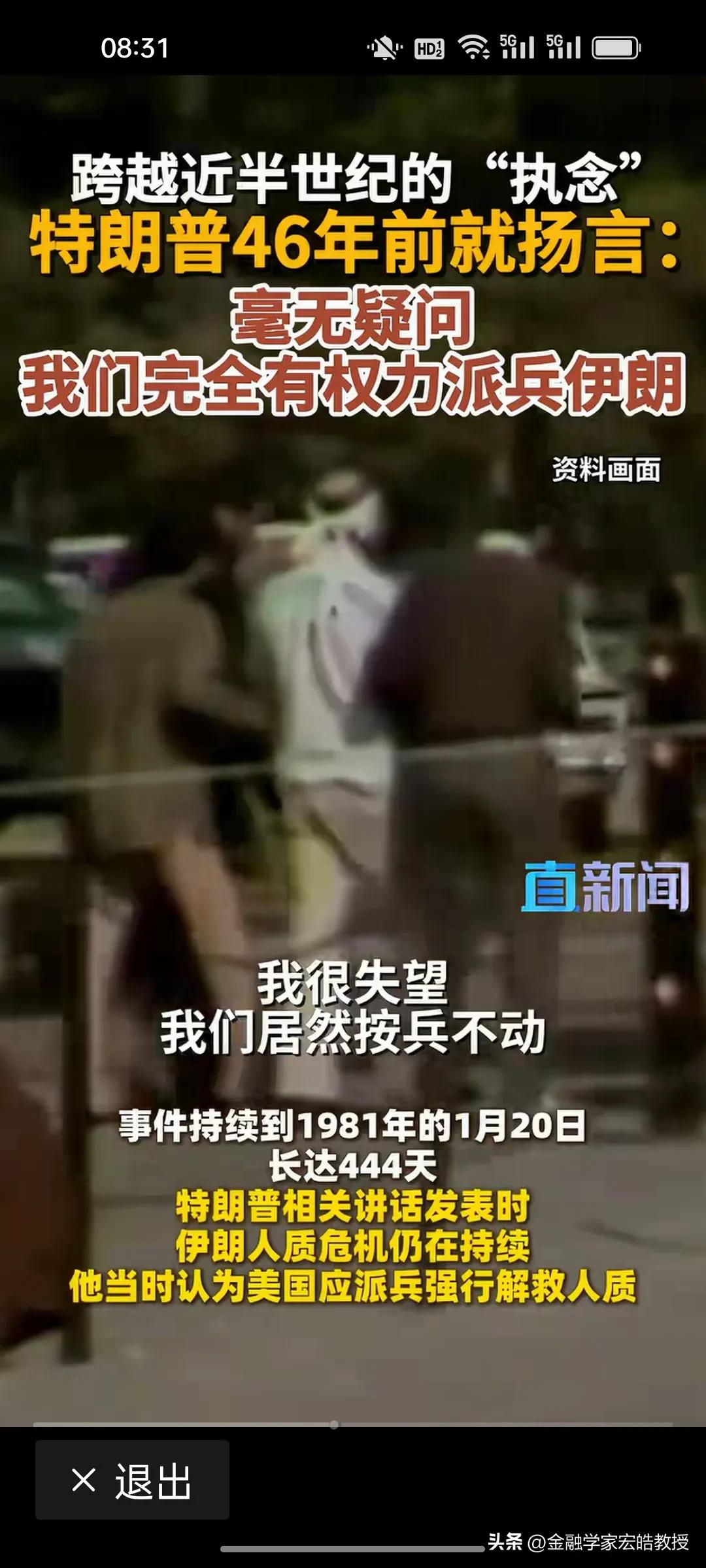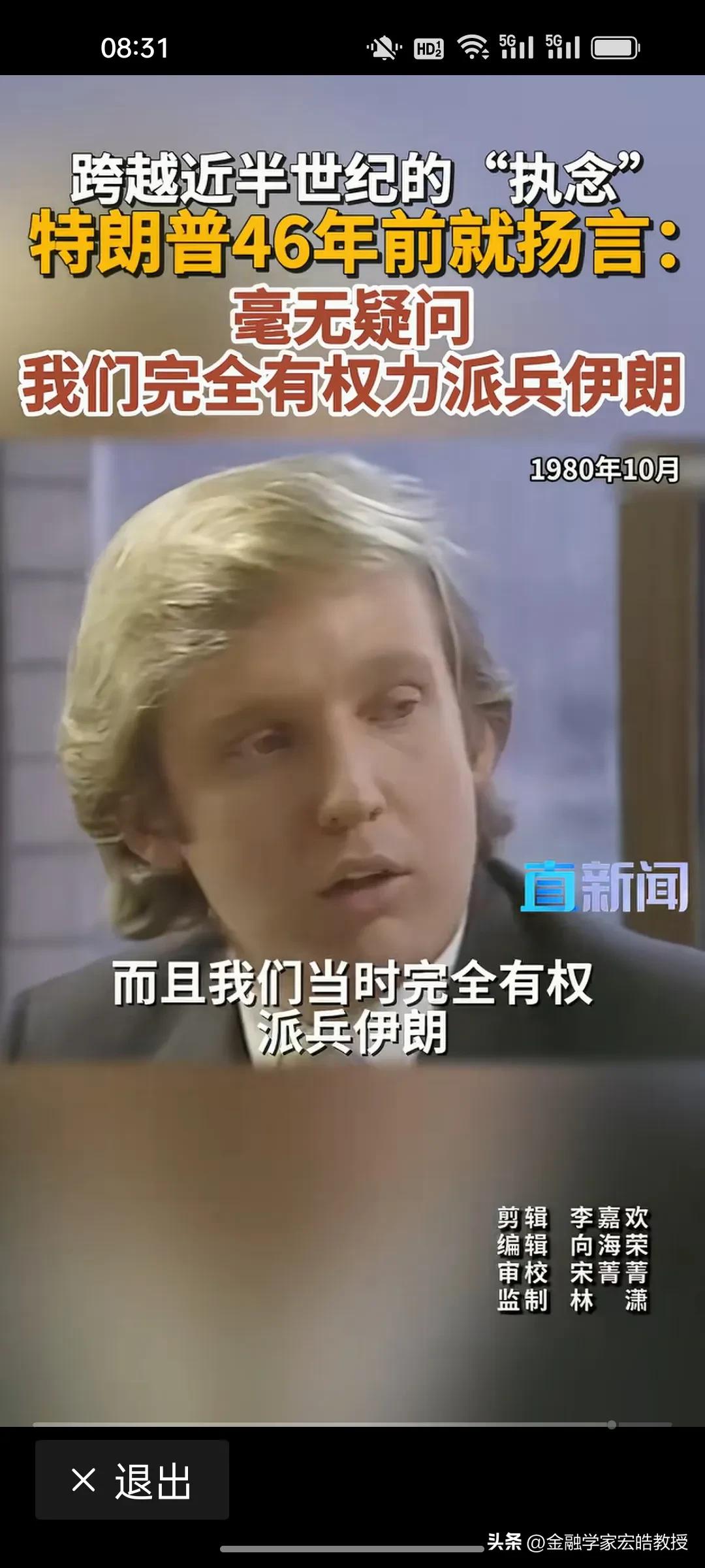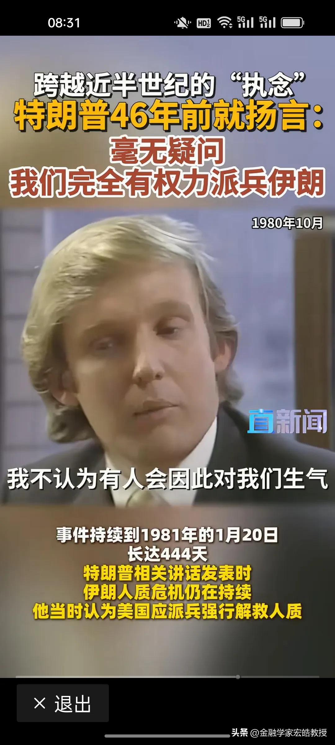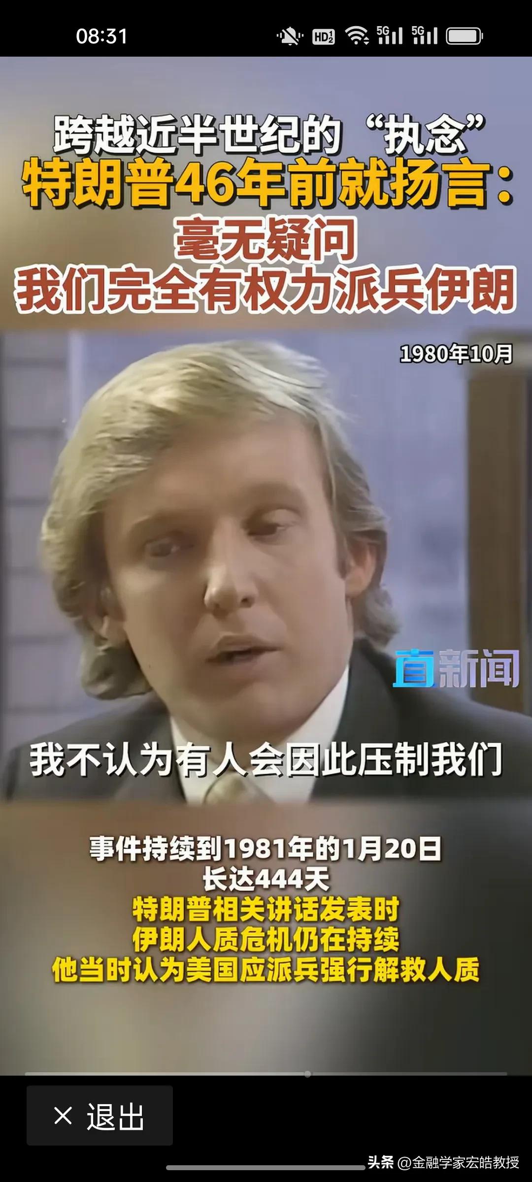 看下图,特朗普对打伊朗这件事执念了46年。 1980年,34岁的地产商人特朗普在电视上公开放话:“美国完全有权派兵伊朗,我们当时就该行动!”那时,他还只是个纽约的年轻地产富豪,却对伊朗人质危机耿耿于怀,坚信武力才是解决问题的答案。 46年后,79岁的他终于用总统权力兑现了当年的“执念”。 从年轻商人到美国总统,特朗普错误的执念一直没变,可战争的代价,却永远由普通人承担。用军事专家张召忠的话说,甚至押上了美国的国运。