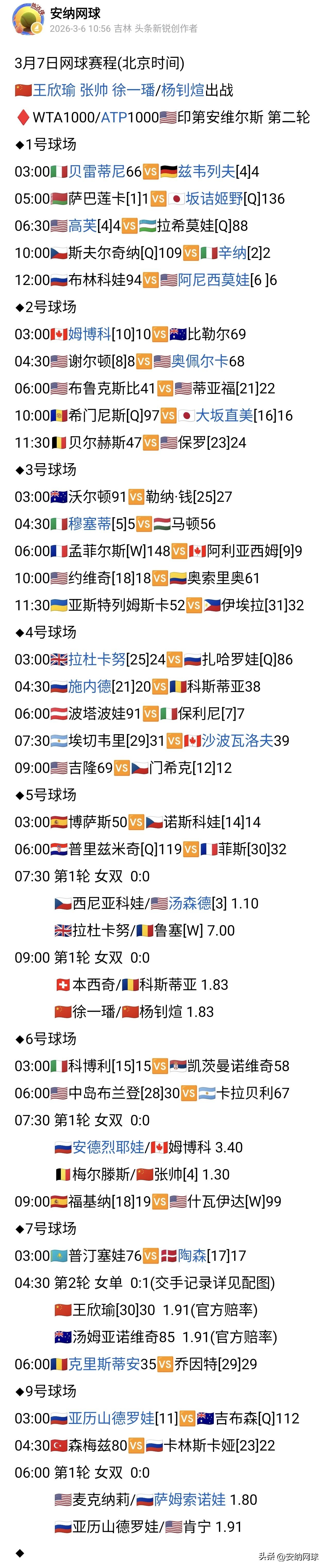 3月7日网球赛程(北京时间) 🇨🇳王欣瑜 张帅 徐一璠/杨钊煊出战 ♦WTA1000/ATP1000🇺🇸印第安维尔斯 第二轮 ◆1号球场 03:00🇮🇹贝雷蒂尼66🆚🇩🇪兹韦列夫[4]4 05:00🇧🇾萨巴莲卡[1]1🆚🇯🇵坂诘姬野[Q]136 06:30🇺🇸高芙[4]4🆚🇺🇿拉希莫娃[Q]88 10:00🇨🇿斯夫尔奇纳[Q]109🆚🇮🇹辛纳[2]2 12:00🇷🇺布林科娃94🆚🇺🇸阿尼西莫娃[6 ]6 ◆2号球场 03:00🇨🇦姆博科[10]10🆚🇦🇺比勒尔69 04:30🇺🇸谢尔顿[8]8🆚🇺🇸奥佩尔卡68 06:00🇺🇸布鲁克斯比41🆚🇺🇸蒂亚福[21]22 10:00🇦🇩希门尼斯[Q]97🆚🇯🇵大坂直美[16]16 11:30🇧🇪贝尔赫斯47🆚🇺🇸保罗[23]24 ◆3号球场 03:00🇦🇺沃尔顿91🆚勒纳·钱[25]27 04:30🇮🇹穆塞蒂[5]5🆚🇭🇺马顿56 06:00🇫🇷孟菲尔斯[W]148🆚🇨🇦阿利亚西姆[9]9 10:00🇺🇸约维奇[18]18🆚🇨🇴奥索里奥61 11:30🇺🇦亚斯特列姆斯卡52🆚🇵🇭伊埃拉[31]32 ◆4号球场 03:00🇬🇧拉杜卡努[25]24🆚🇷🇺扎哈罗娃[Q]86 04:30🇷🇺施内德[21]20🆚🇷🇴科斯蒂亚38 06:00🇦🇹波塔波娃91🆚🇮🇹保利尼[7]7 07:30🇦🇷埃切韦里[29]31🆚🇨🇦沙波瓦洛夫39 09:00🇺🇸吉隆69🆚🇨🇿门希克[12]12 ◆5号球场 03:00🇪🇸博萨斯50🆚🇨🇿诺斯科娃[14]14 06:00🇭🇷普里兹米奇[Q]119🆚🇫🇷菲斯[30]32 07:30 第1轮 女双 0:0 🇨🇿西尼亚科娃/🇺🇸汤森德[3] 1.10 🇬🇧拉杜卡努/🇷🇴鲁塞[W] 7.00 09:00 第1轮 女双 0:0 🇨🇭本西奇/🇷🇴科斯蒂亚 1.83 🇨🇳徐一璠/🇨🇳杨钊煊 1.83 ◆6号球场 03:00🇮🇹科博利[15]15🆚🇷🇸凯茨曼诺维奇58 06:00🇺🇸中岛布兰登[28]30🆚🇦🇷卡拉贝利67 07:30 第1轮 女双 0:0 🇷🇺安德烈耶娃/🇨🇦姆博科 3.40 🇧🇪梅尔滕斯/🇨🇳张帅[4] 1.30 09:00🇪🇸福基纳[18]19🆚🇺🇸什瓦伊达[W]99 ◆7号球场 03:00🇰🇿普汀塞娃76🆚🇩🇰陶森[17]17 04:30 第2轮 女单 0:1(交手记录详见配图) 🇨🇳王欣瑜[30]30 1.91(官方赔率) 🇦🇺汤姆亚诺维奇85 1.91(官方赔率) 06:00🇷🇴克里斯蒂安35🆚乔因特[29]29 ◆9号球场 03:00🇷🇺亚历山德罗娃[11]🆚🇦🇺吉布森[Q]112 04:30🇹🇷森梅兹80🆚🇷🇺卡林斯卡娅[23]22 06:00 第1轮 女双 0:0 🇺🇸麦克纳莉/🇷🇺萨姆索诺娃 1.80 🇷🇺亚历山德罗娃/🇺🇸肯宁 1.91 ◆