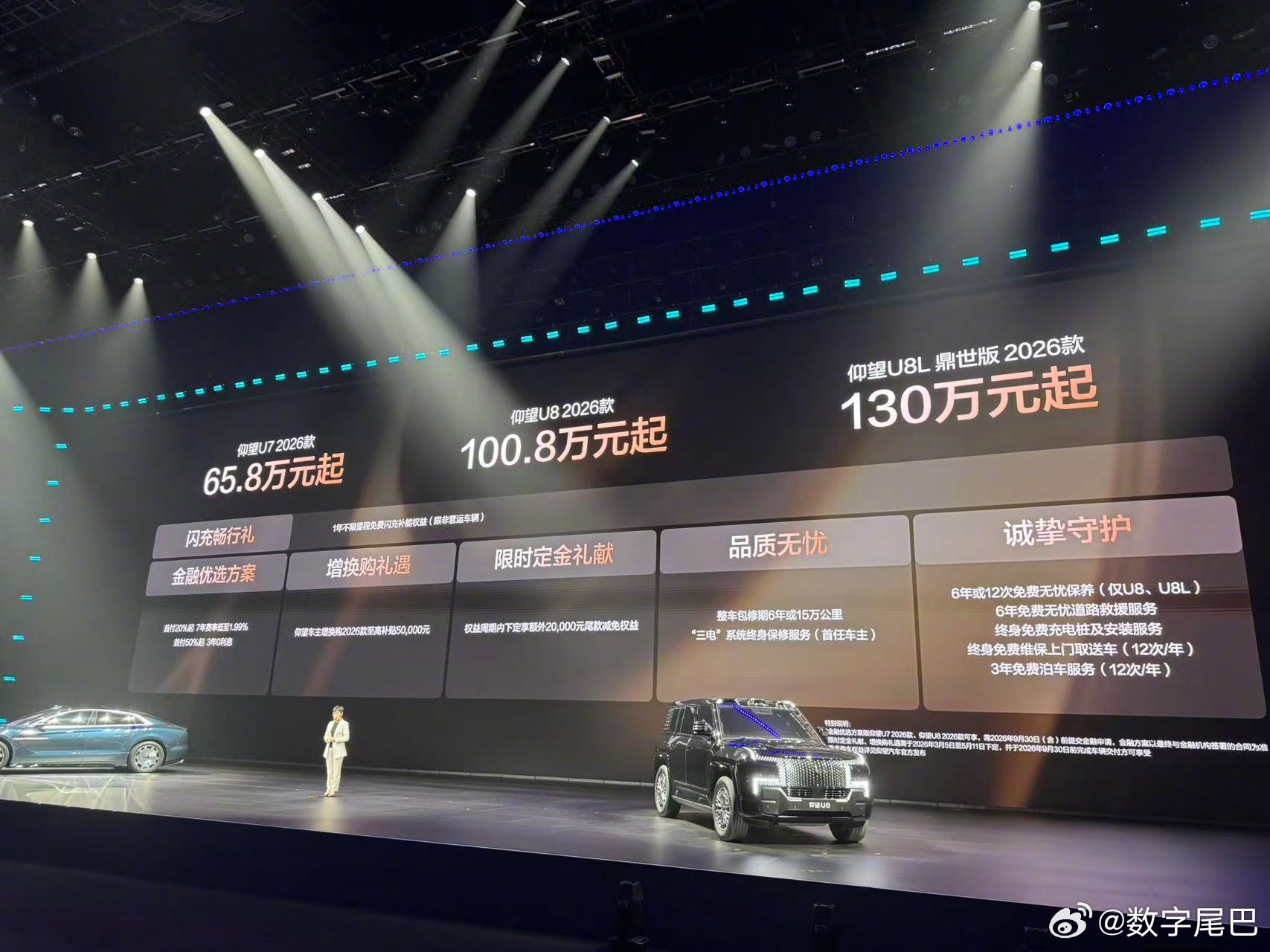 3、仰望 U8L 2026 款升级应急浮水紧急自动激活、NOA 爆胎稳行稳停、全场景隐私安全,老款车型后续可通过 OTA,售价 130 万元起
