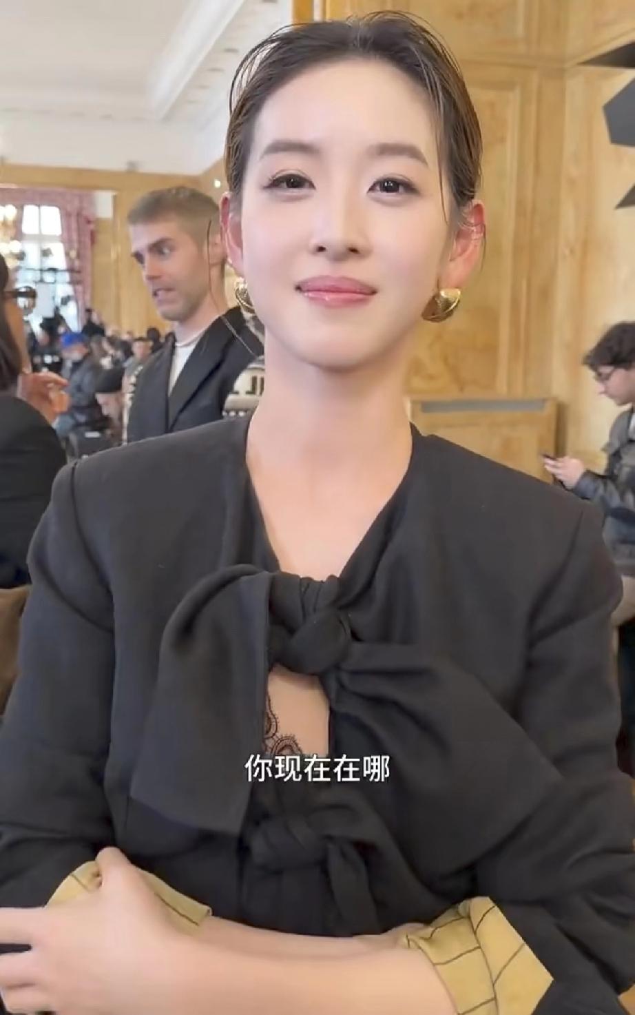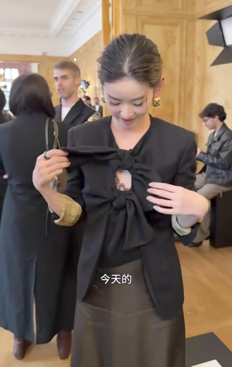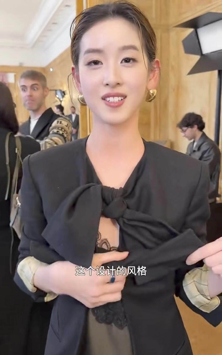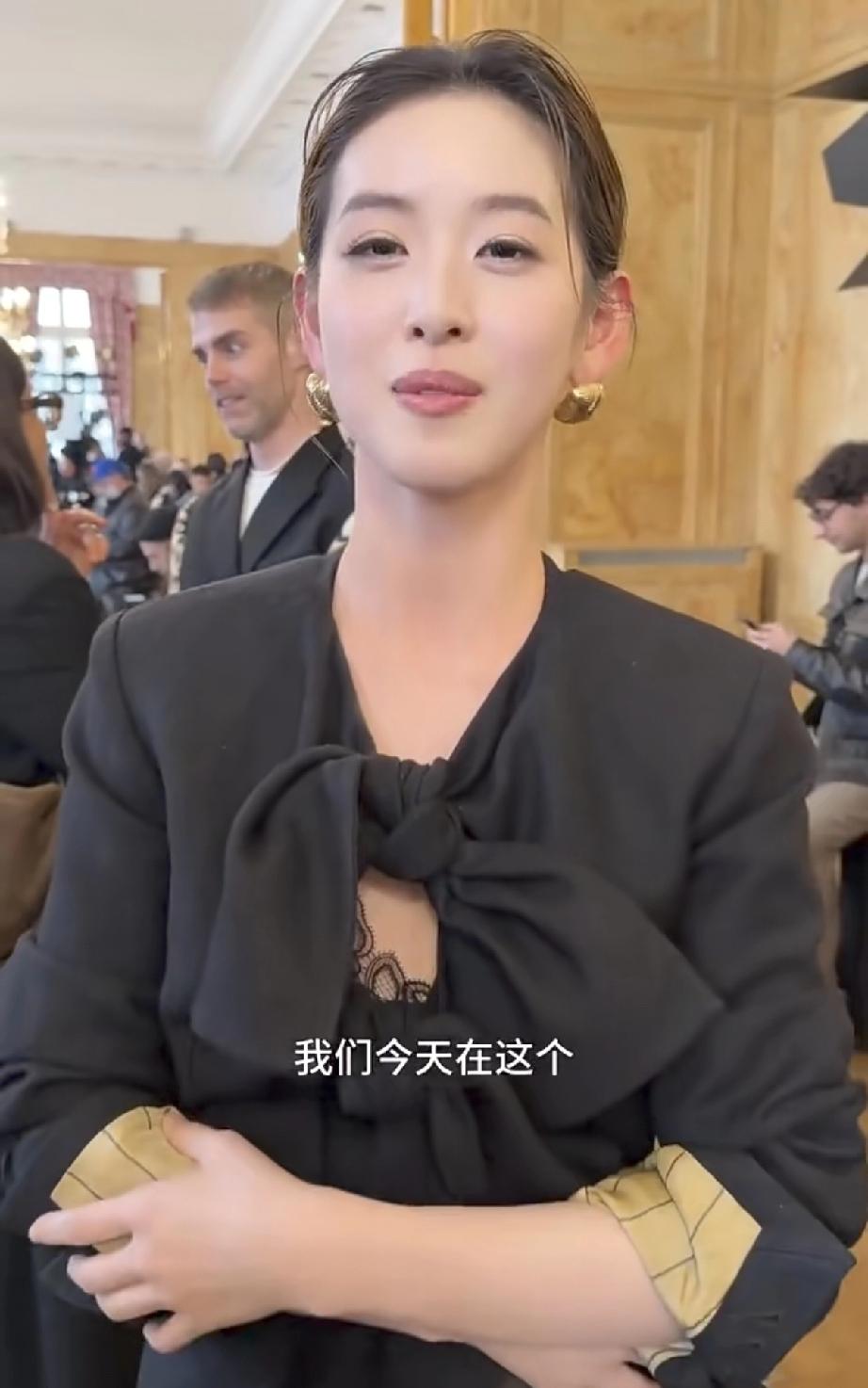 章泽天巴黎看秀,终于有了名媛气质! 近日,章泽天在录制完第2期播客节目之后,远赴巴黎时装周,那里才是她真正的战场。 3月6日,有网友晒出在巴黎时装周的UMA WANG大秀现场偶遇章泽天的视频,这回的章泽天名媛气质满满,终于和以前不一样了。 记得曾经的章泽天去伦敦等地参加艺术展,总是披着头发,头发染了棕黄色,烫了小卷卷,显得比较毛躁,与自身气质不搭配,遭到调侃。 这一次到巴黎时装周的章泽天精心打扮了一番,估计是请教了高手级别的造型师吧,选择了最适合自己的妆容,瞬间气质与众不同。 她把头发盘了起来,戴了一双金黄色的扣式的下垂耳环,一身黑色搭配,中间有蝴蝶结,打破了黑色西装的严肃感,内搭还有蕾丝,更加衬托出了女性的精致,还有一丝东方禅意的美学。 怪不得章泽天在介绍自身穿搭时,低头一件一件认真介绍,笑得好灿烂,可见她对这身衣服是非常满意的,直接让气质提升了不止一个档次,终于向名媛看齐了。 再看章泽天脸上妆容精致,脸虽然变圆润了,肯定比不上年轻时了,毕竟她已经结过婚,生过孩子当了妈妈了,但整体上造型是非常不错的。 因为她的脸皮肤很白皙光滑,没有皱纹,嘴唇发亮轮廓明显,加上她优雅的动作,此时的她真是名媛,贵妇级别的。