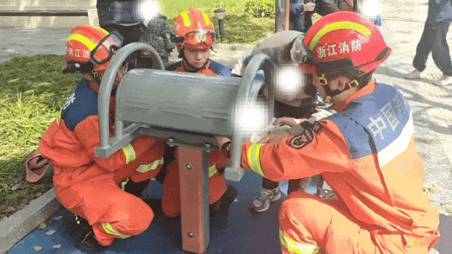 男孩头部卡进健身器材里