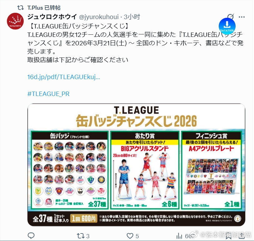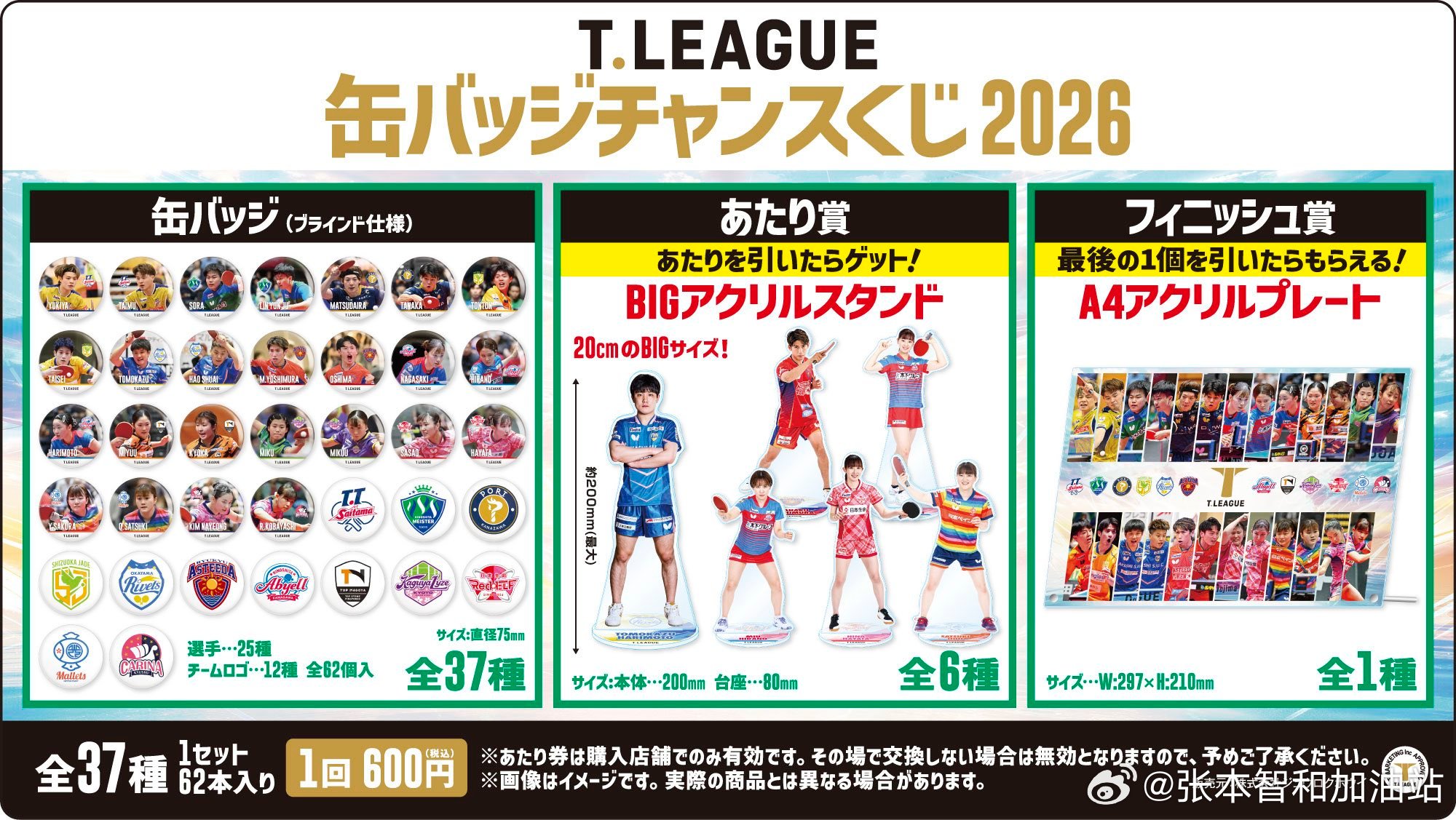 日本乒乓球t联赛张本智和 T联赛徽章抽签“‘T.LEAGUE 罐装徽章抽奖活动’将于 2026 年 3 月 21 日星期六起在唐吉诃德商店、书店和全国各地的其他地点举行,该活动汇集了所有 12 支 T.LEAGUE 球队的热门球员。请查看下方参与活动的门店列表 16d.jp/pdf/TLEAGUEkuji_tenpo_260321.pdf”(机翻)Cr: T.plus