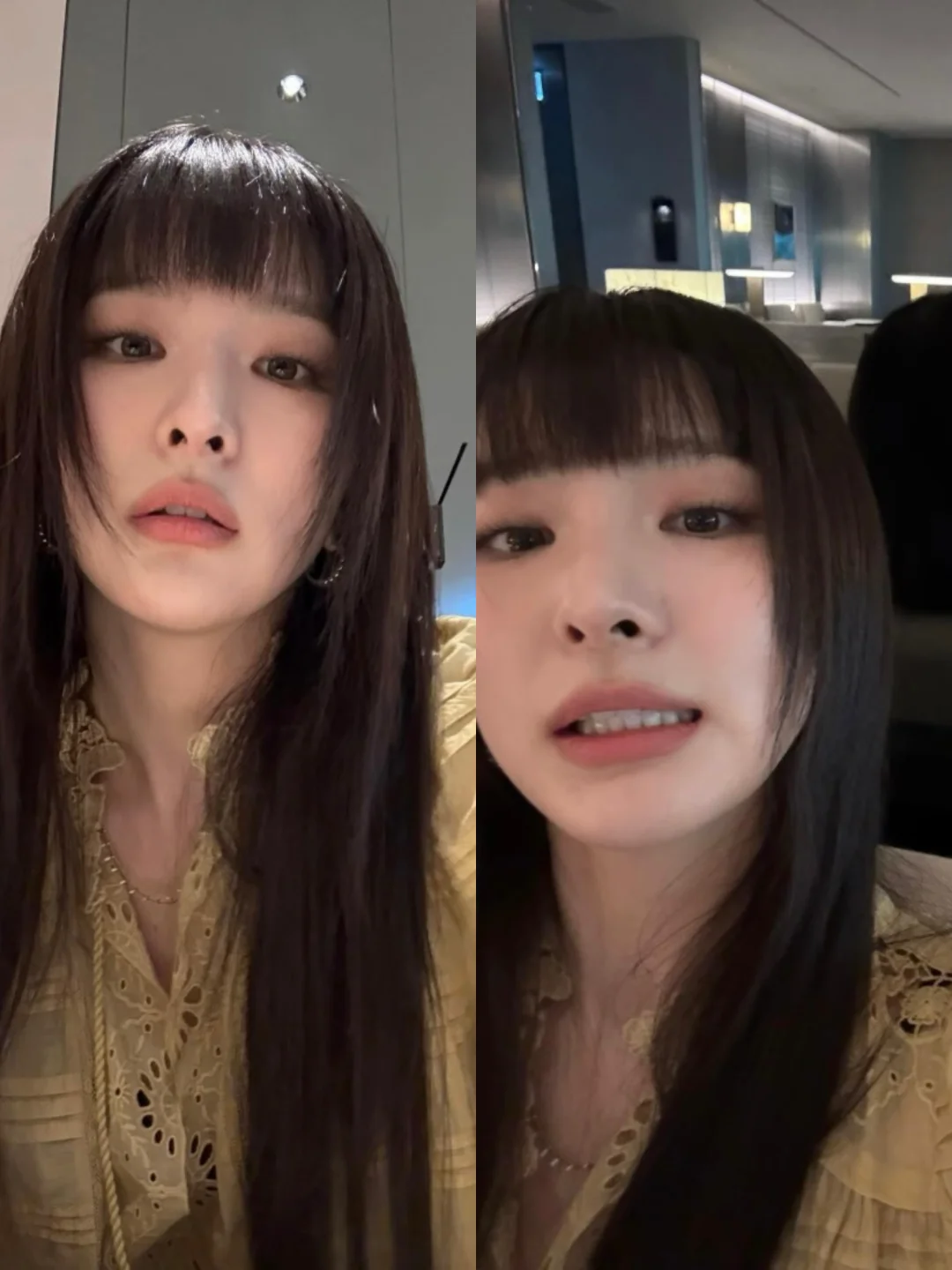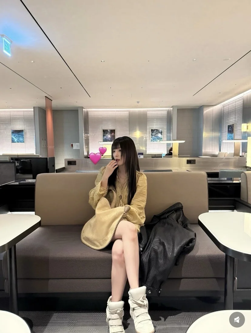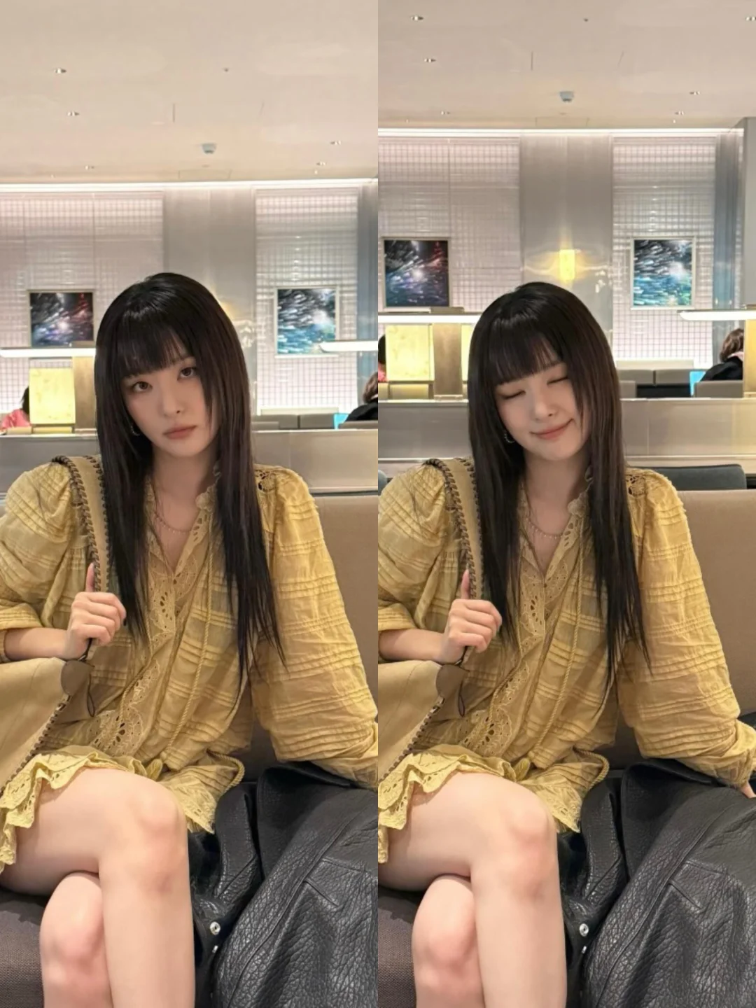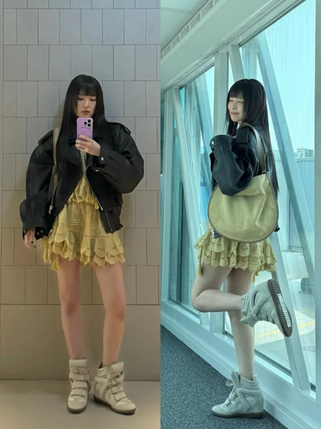 这一身真的眼前一亮,眉上刘海yyds,姜黄色连衣裙yyds,皮衣yyds,衣品超绝,爱了