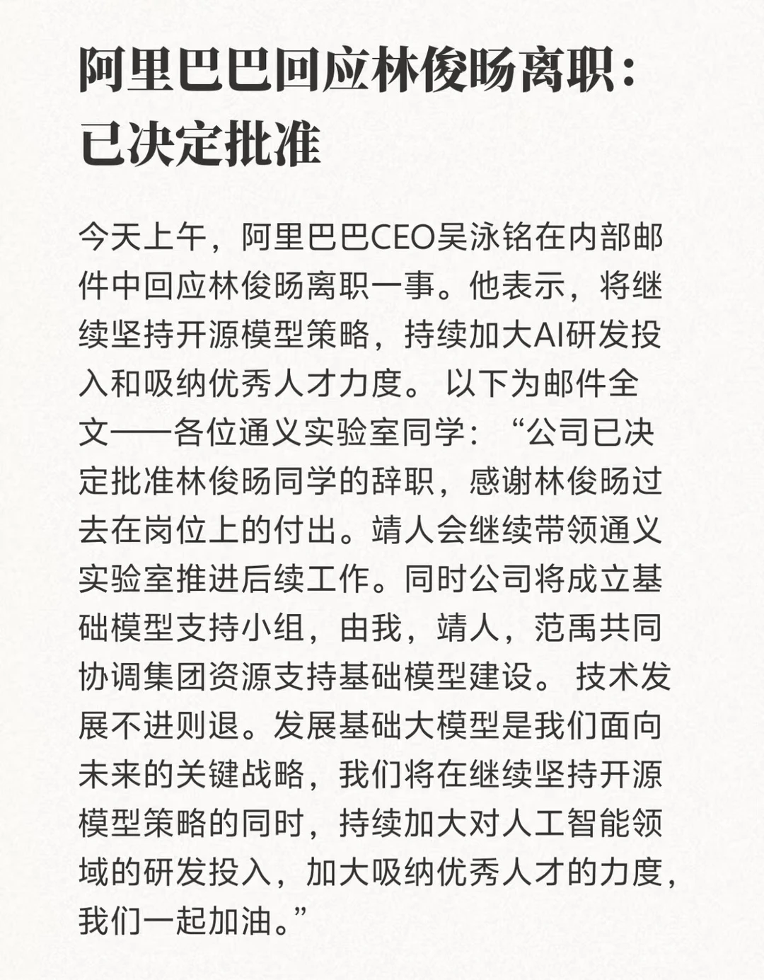 公司已决定批准林俊旸同学的辞职,感谢林俊旸过去在岗位上的付出。靖人会继续带领通义实验室推进后续工作。同时公司将成立基础模型支持小组,由我,靖人,范禹共同协调集团资源支持基础模型建设。