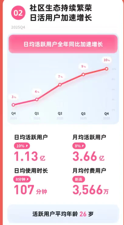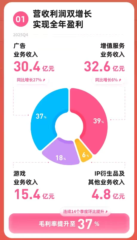 更值得关注的是用户数据。Q4日活1.13亿,同比增长10%;月活3.66亿;日均使用时长107分钟,比去年多了8分钟。注意一个细节:这已经是连续四个季度用户增长在提速。而在流量红利逐渐退去的时候,各家大厂都在存量里抠数据,能稳住不跌就算赢。B站还能保持两位数的用户增长,还把时长往上拉,确实有点东西的。