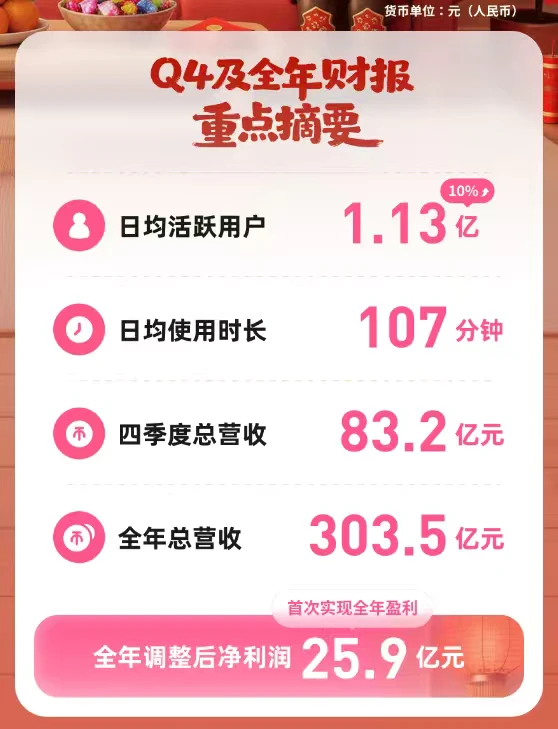 先看几个核心数字:全年营收303.5亿,调整后净利润25.9亿——这是B站成立以来第一次全年盈利。单看Q4更猛,营收83.2亿,净利润同比暴涨478%。这增速放在现在的互联网大盘里,已经不是“回暖”能形容的了。