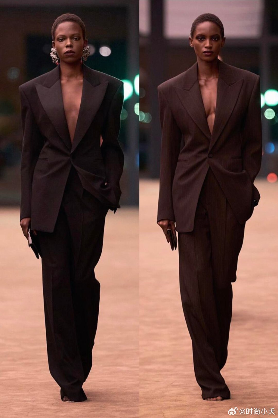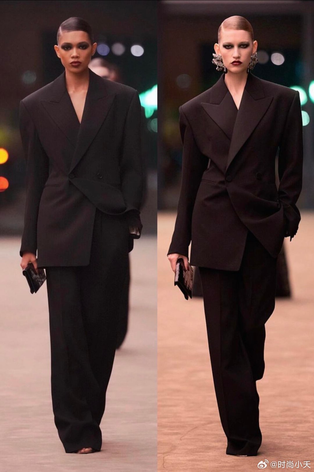 如今 Saint Laurent 由 Anthony Vaccarello 掌舵,他明确将西装轮廓作为品牌标志,强肩、收腰、细长比例,确实漂亮。但连续看几季秀,会发现轮廓几乎没变,有人调侃每季只是在调整肩宽和裤宽。