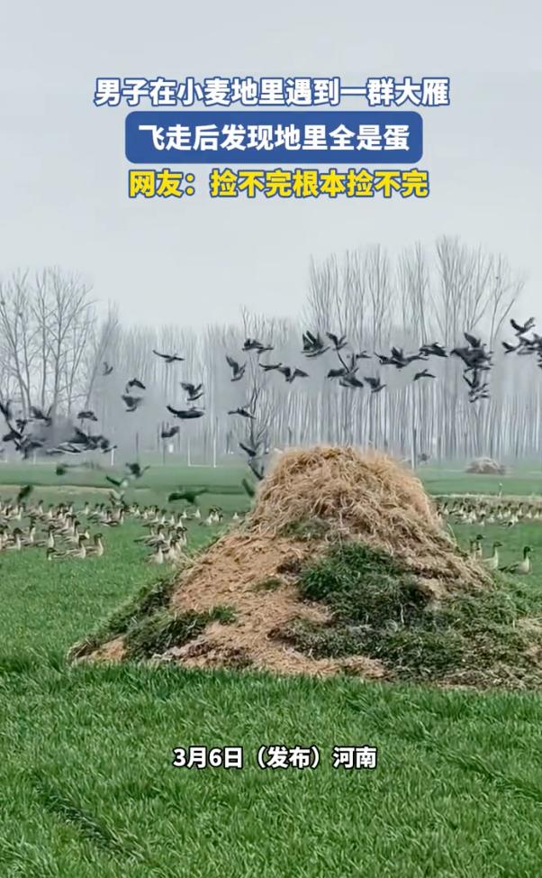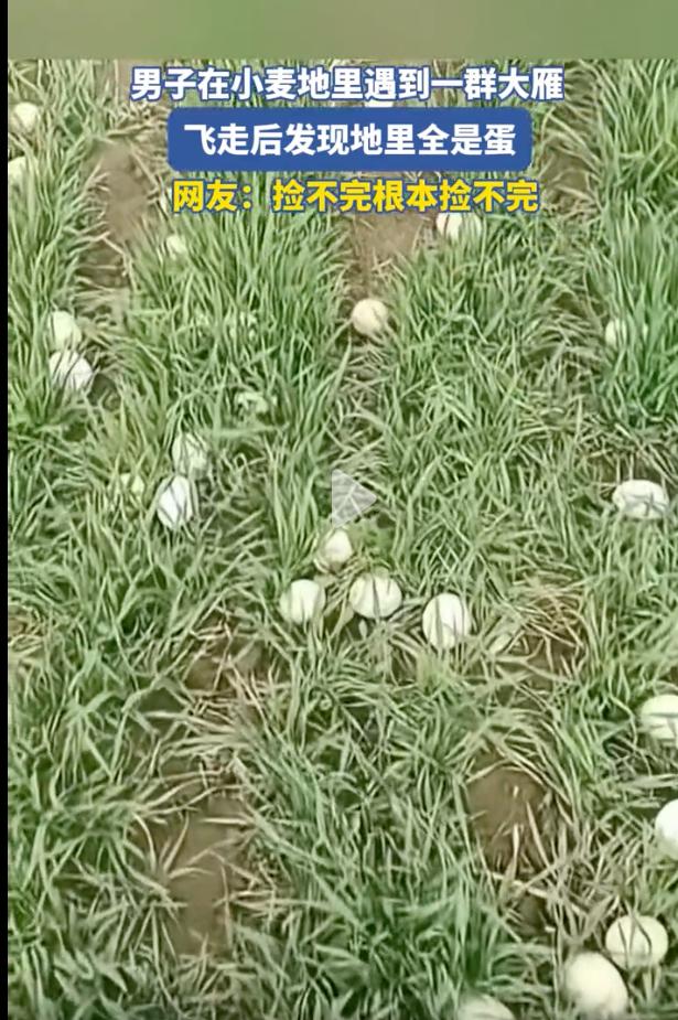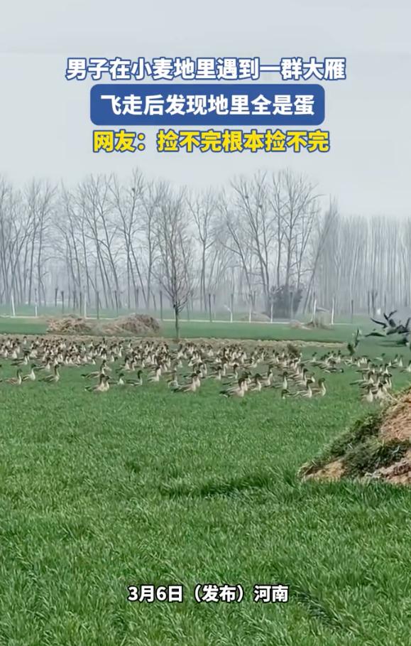 这下捡到宝了!河南,一男子路过自家麦地,发现黑压压的雁群腾空而起,低头一看直接愣在原地,漫山遍野全是白花花的鸟蛋,网友调侃:捡不完根本捡不完。 当天,这名男子正打算去地里瞅瞅麦苗长势,老远就瞧见绿油油的地里密密麻麻聚着几百只大鸟,脖子细长,正扑棱着翅膀在那儿闹腾。 还没等他走近,受惊的鸟群呼啦一下全飞上了天,遮天蔽日的场面相当震撼,等大伙儿飞走后,男子低头一瞅,地里跟撒了白元宵似的。 这些蛋大咧咧地躺在泥土里,连个像样的窝都没有,有的三五成群挤成堆,有的孤零零地夹在麦缝里,数量多得让人数不过来。 评论区里一下子炸了锅,大伙儿都在好奇这到底是啥神仙运气,能不能回家加个餐。 有人直言这就是雁鹅,也就是咱们常说的铁锅炖大雁那个品种,本就是人工养殖的,估计是附近哪个养殖场没关好,跑出来集体“野炊”了。 也有人怀疑是摆拍,觉得大雁下蛋极其讲究地方,哪能跟下冰雹似的随地乱扔。 其实这种大鸟大概率是家养雁鹅,它们保留了一部分野性,但早已被驯化,下蛋频率比野雁高得多。 这种鹅在受到惊吓或者产生应激反应时,确实会顾不上筑巢,随地就把蛋给产了。 大伙儿最关心的还是这蛋能不能捡,说实话,这“馅饼”可不能乱吃。 要是纯野生的保护动物,你私自捡回家,那就涉嫌违反野生动物保护法,为了几口鲜把自个儿送进去踩缝纫机,真不值当。 退一步说,即便真是养殖场跑出来的,那这些蛋也属于人家的私人财产,这种“捡漏”行为在法律上涉嫌非法占有。 真碰上这种奇观,最稳妥的法子是原地别动,赶紧给林业部门打个电话或者报个警,让专业的人来鉴定处理。 男子麦田遇雁群 走近地上全是蛋