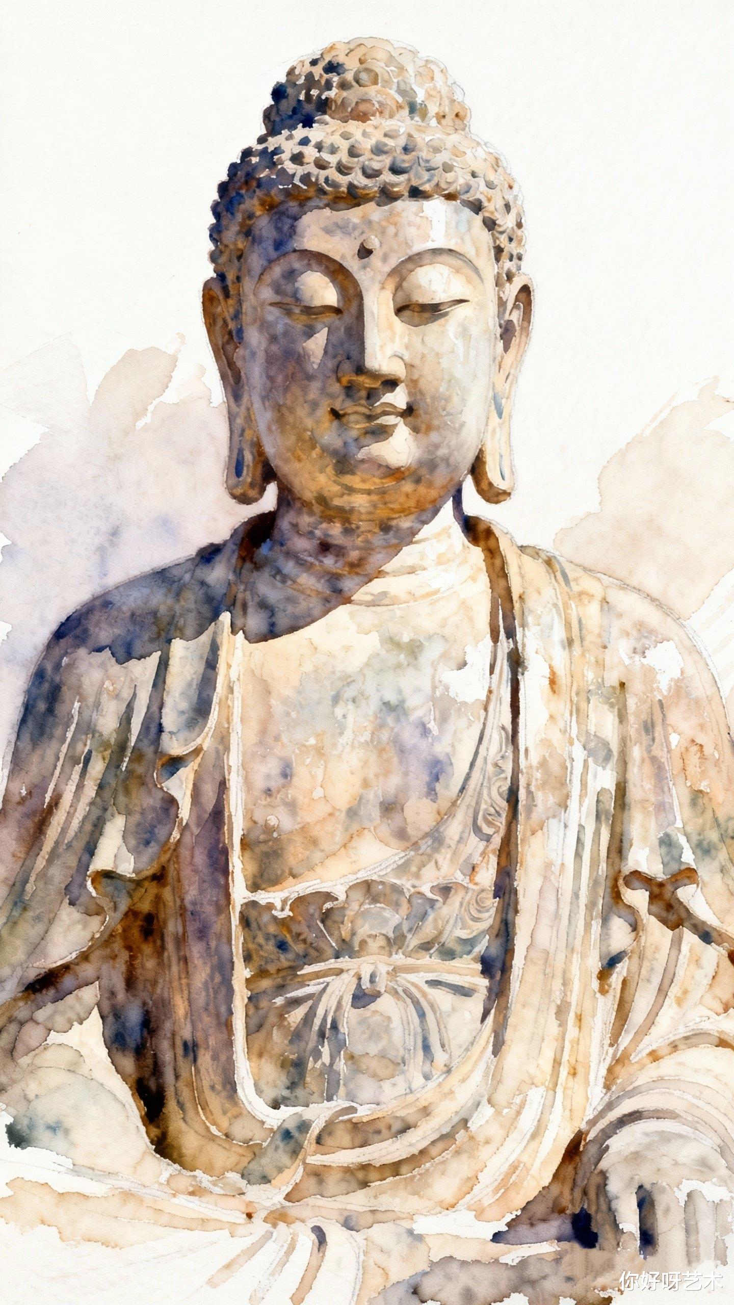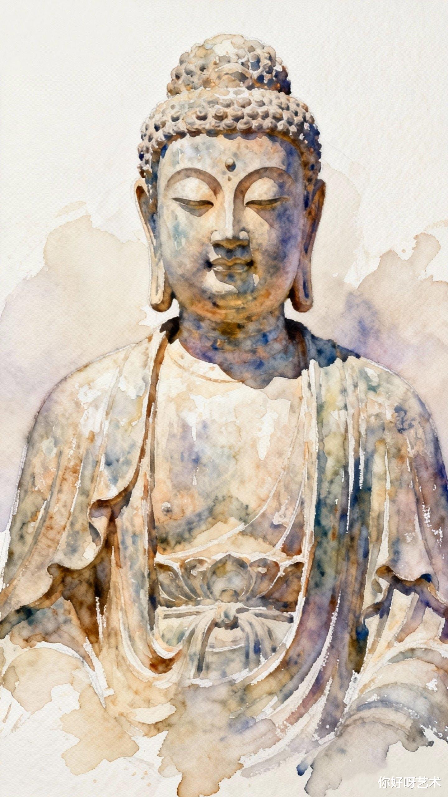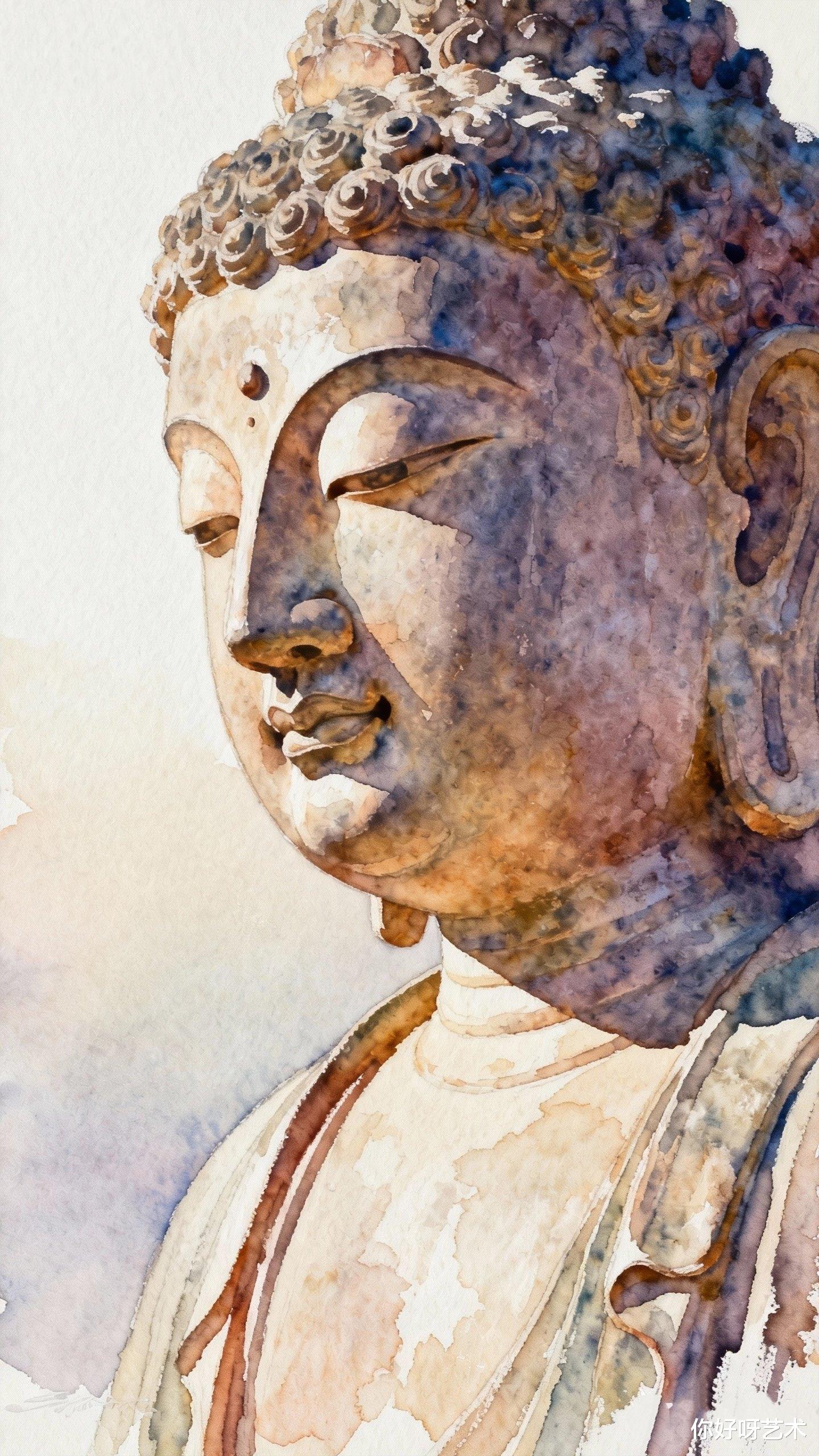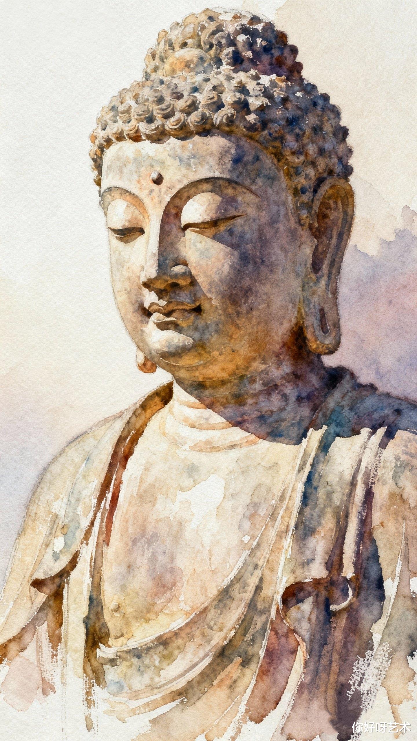 水彩,这流动的色彩,恰似佛法中那无常的智慧。它不似油画般厚重,也不似水墨那般纯粹,却以其独特的透明与层次,在纸上绽放出别样的光彩。我轻蘸笔尖,让清水在调色盘中晕开,再缓缓滴入几滴赭石。这赭石色,是佛像肌肤的底色,也是我心中对佛最本真的想象。笔尖轻触纸面,色彩便如流水般自然流淌,勾勒出佛像那庄严而慈悲的面容轮廓。