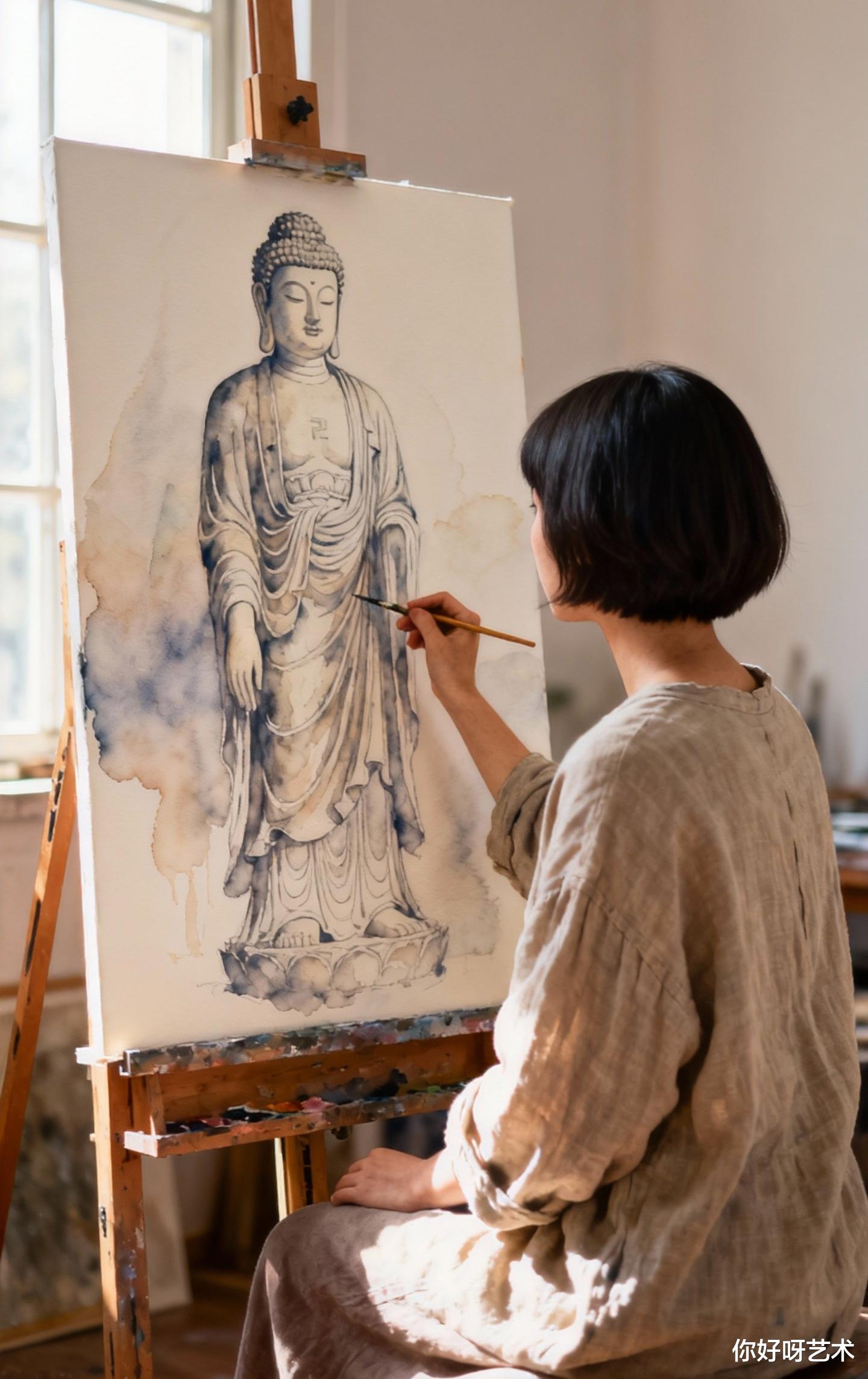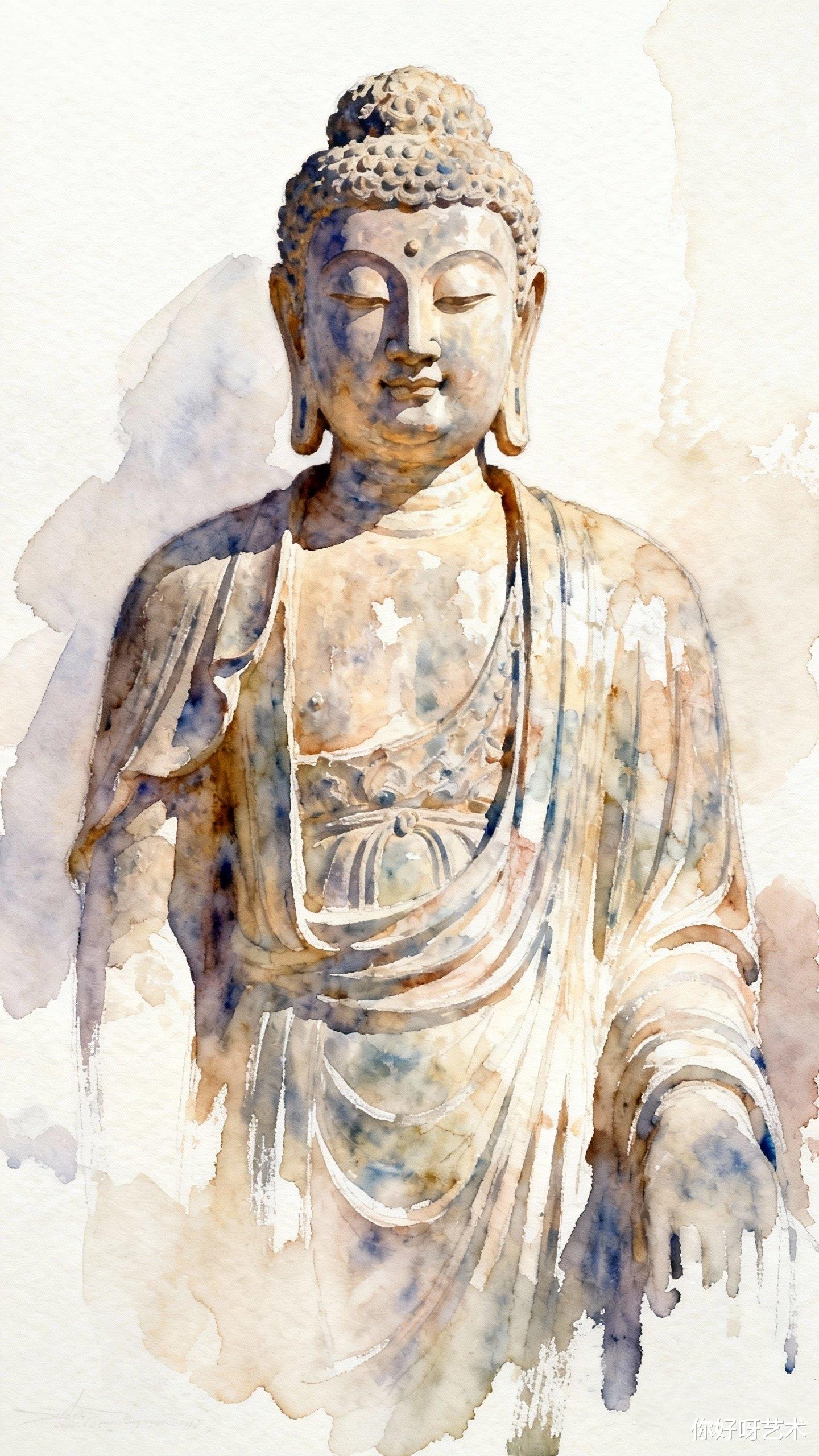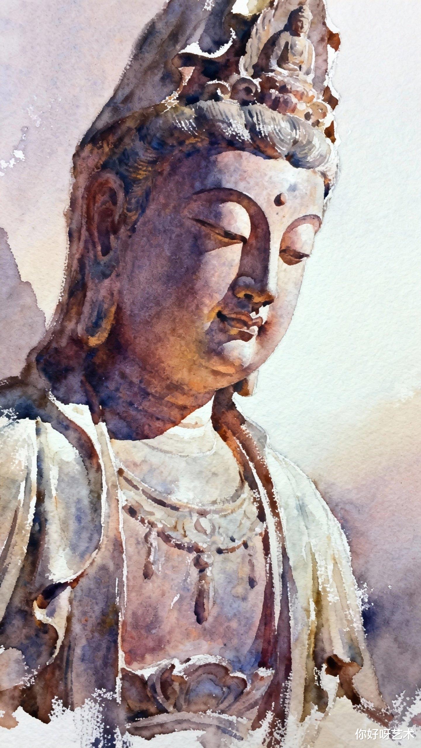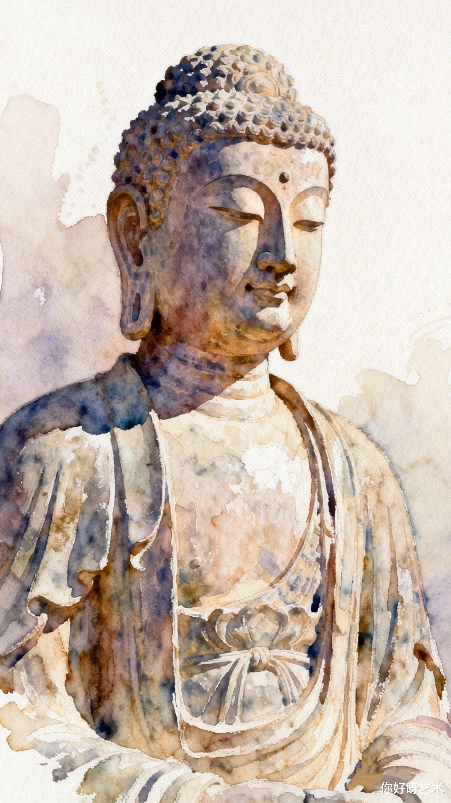 水彩,这流动的色彩,恰似佛法中那无常的智慧。它不似油画般厚重,也不似水墨那般纯粹,却以其独特的透明与层次,在纸上绽放出别样的光彩。我轻蘸笔尖,让清水在调色盘中晕开,再缓缓滴入几滴赭石。这赭石色,是佛像肌肤的底色,也是我心中对佛最本真的想象。笔尖轻触纸面,色彩便如流水般自然流淌,勾勒出佛像那庄严而慈悲的面容轮廓。