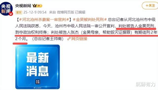 2025年12月9日,央视新闻报道,河北沧州杀妻案一审判决出炉:金昊死刑,母亲张杰因帮助毁灭证据获刑两年两个月。