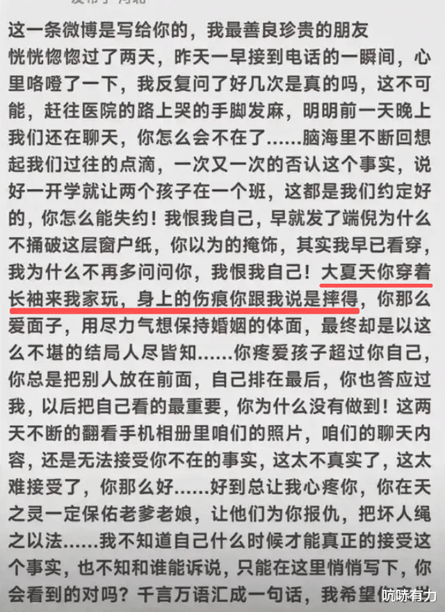 瑶瑶朋友曾公开发声,瑶瑶大夏天穿着长袖为了遮身上的伤痕,被发现后还说是摔的。