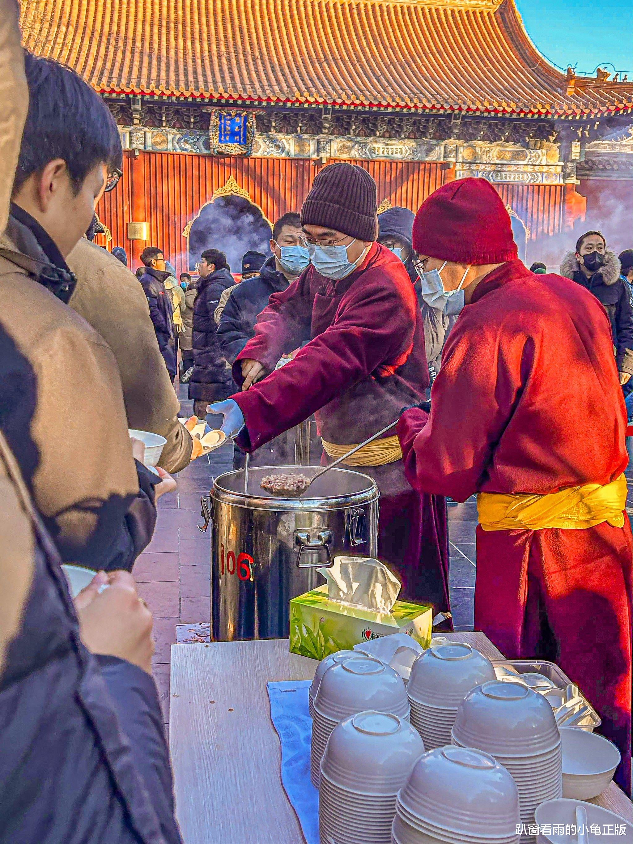 自清代雍正帝起,每逢腊八,必在雍和宫内举行隆重的腊八盛典,用铜制大锅熬粥,由僧人念经,并派专员上祭、拈香。北京当地乃至外地的信众则从四面八方群聚而来,争相讨取僧人诵经加持的“佛粥”,以求吉祥平安。至今,雍和宫仍保持着腊八舍粥的传统。