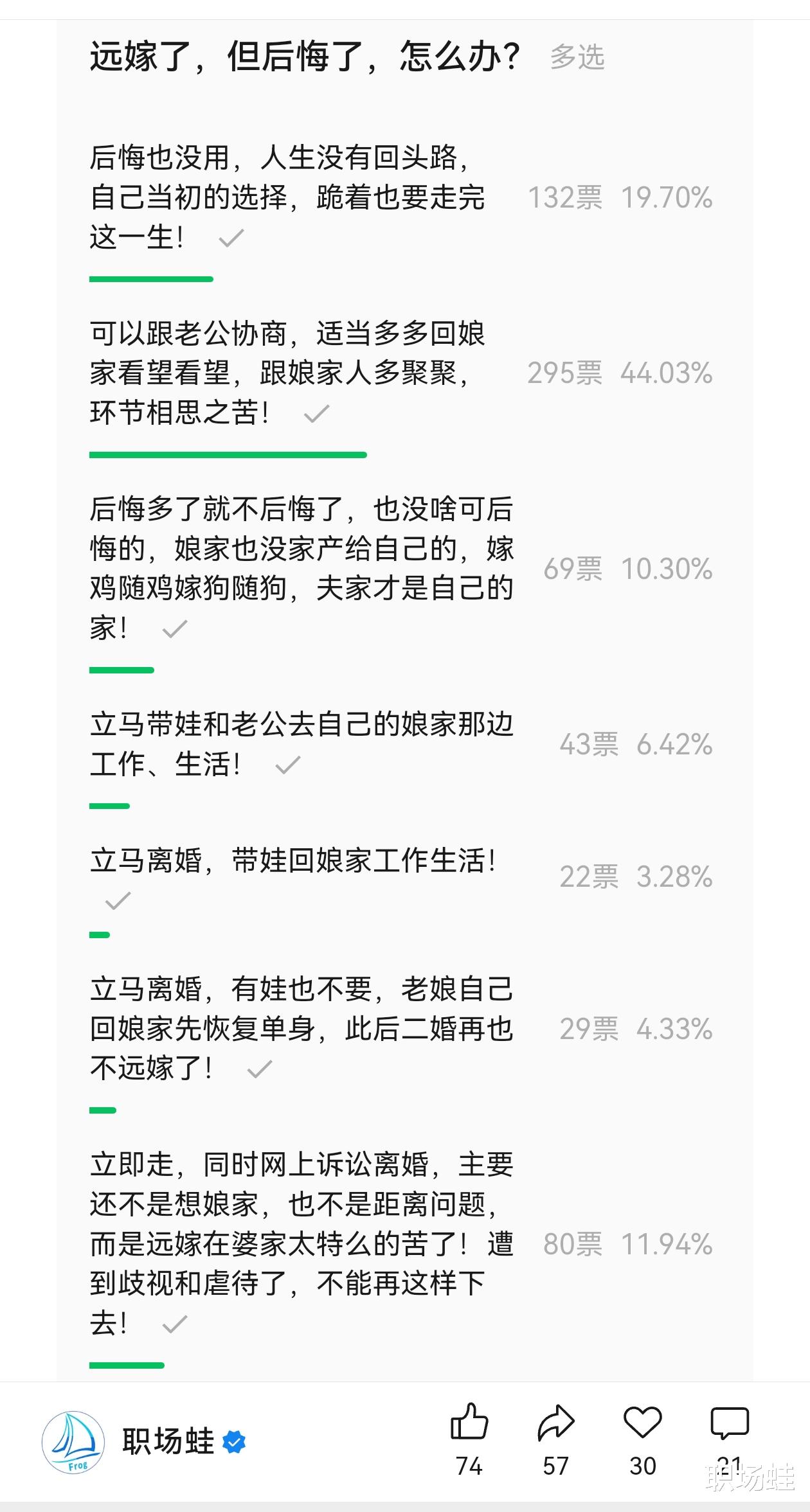 虽然没有共性的答案,但还是可以看下大家的态度的,尤其对远嫁的看法。那么现在就问你:远嫁了,但后悔了,怎么办?