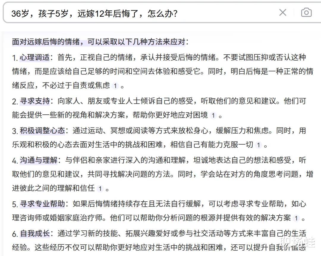 不得了,主要是鸡汤。说要做好心理调节,要向家人、朋友和专业人士倾诉自己的感受,听取他们的意见和建议,调整心态,相信自己,克服一切,增加沟通与理解,可以寻求心理咨询师和婚姻专家的帮助,最后,建议通过学习新技能、拓展兴趣爱好、参与更多社交,从而实现自我成长,说是这样远嫁问题就解决了。