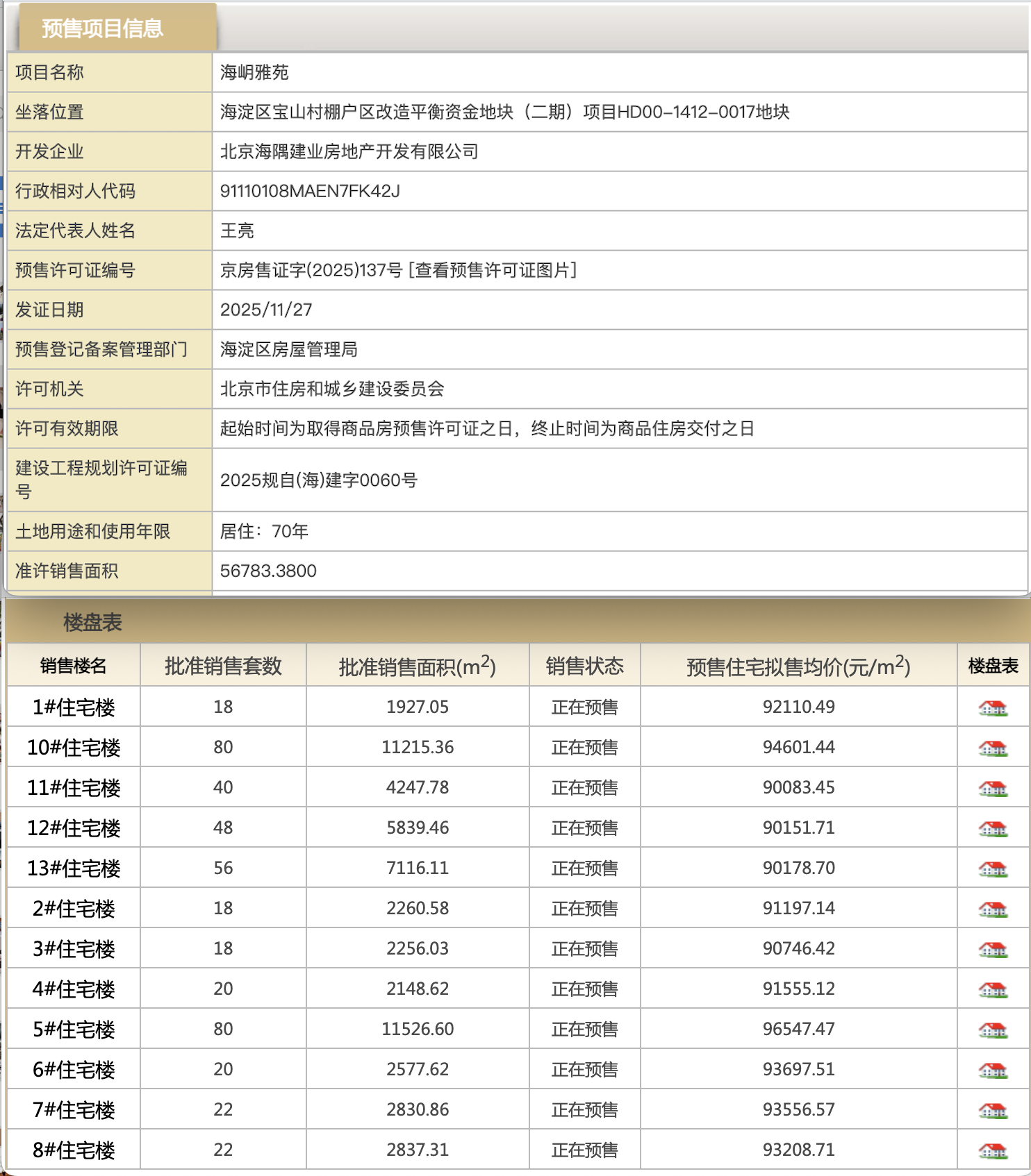 据了解,北京隅海岄于11月27日取得预售许可证。首批12栋住宅楼,仅西侧9#楼不在预售证内;共442套房源,预售均价9.3万元/㎡;最贵的一栋为5#楼,次顶层两套建面约145㎡的边户,单价突破10万+。
