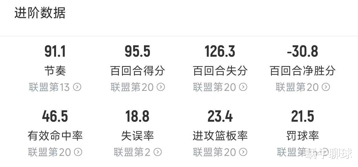 更糟糕的是,他们进攻差就算了,就连防守也是一塌糊涂,全队场均只有2.2次盖帽,每场比赛丢失95.9分,百回合失分126.3分,百回合净胜分是负30.8,除此之外,全队场均助攻数、有效命中率、投篮命中数、进攻篮板数、后场篮板数等多项数据也都是全联盟倒数第一。