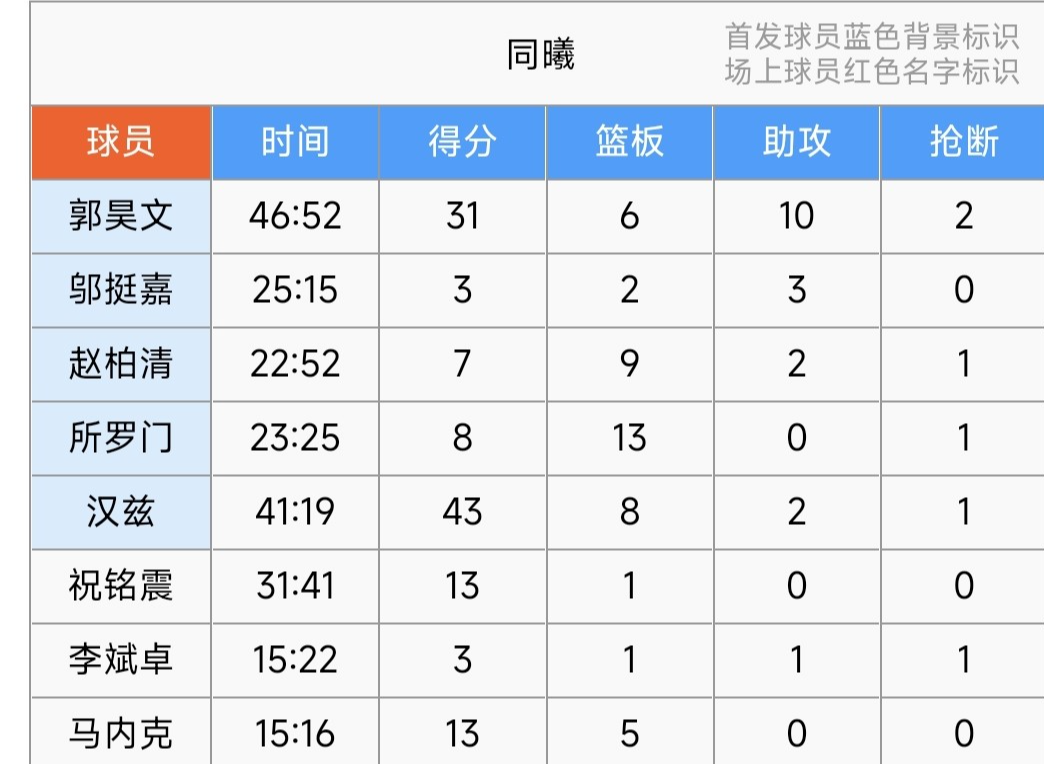 同曦男篮:汉兹43分8板2助、郭昊文31分6板10助2断、马内克13分5板、祝铭震13分1板、所罗门8分13板、赵柏清7分9板2助。
