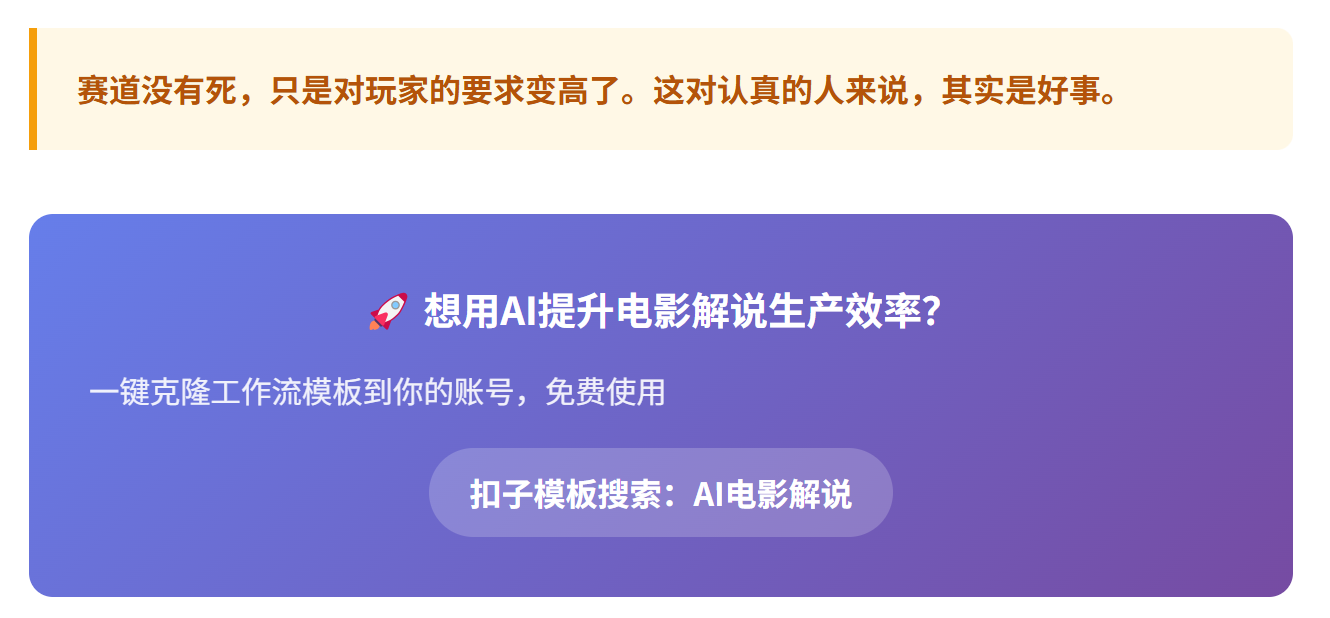 核心判断:电影解说赛道正在从"增量市场"转向"存量博弈"。 新玩家进入的窗口在收窄,但头部玩家的天花板在抬高。换句话说,这个赛道不是没机会了,而是机会的性质变了。