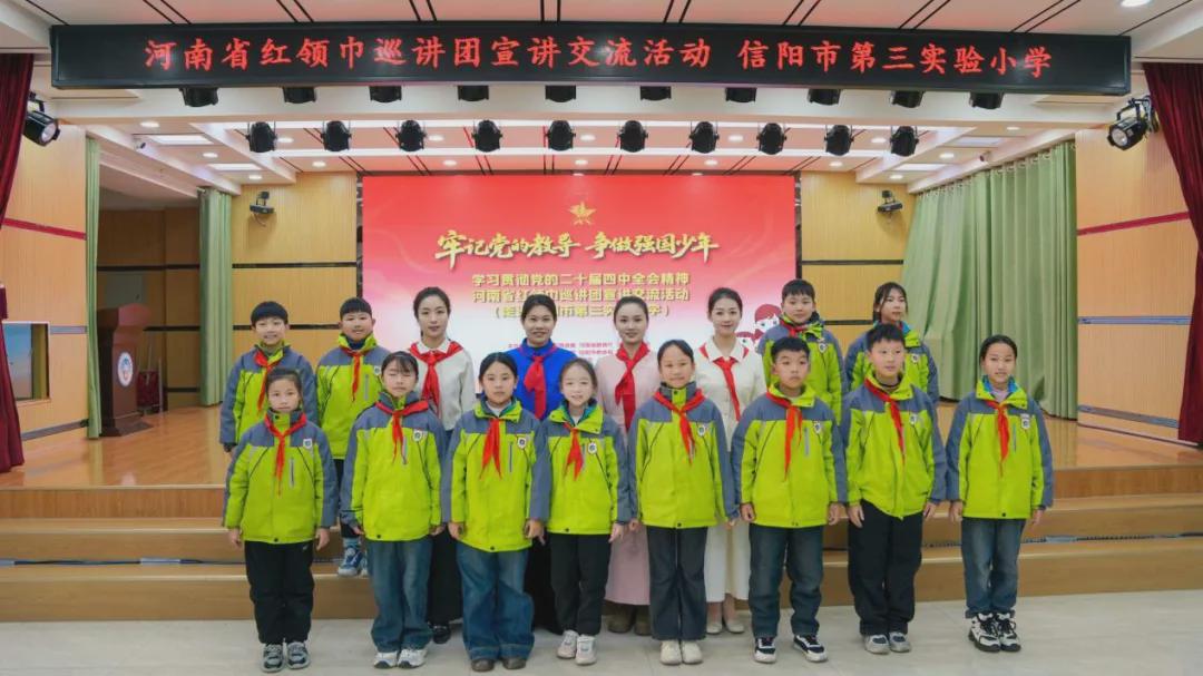 为深入学习宣传贯彻党的二十届四中全会精神,引导广大师生牢记领袖嘱托、勇担时代使命,2025年12月18日,由共青团河南省委、省少工委主办,共青团信阳市委、信阳市少工委、羊山群团工作部等共同承办的河南省红领巾巡讲团宣讲活动走进信阳市第三实验小学,带来了一场内涵丰富、形式生动的精神盛宴。
