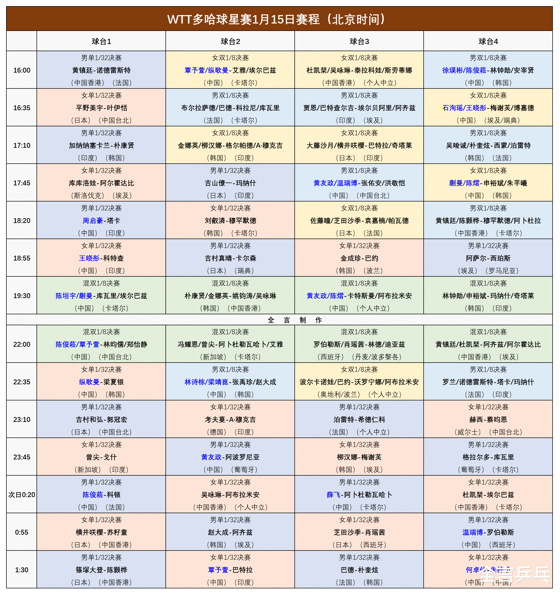 16:00,徐瑛彬/陈俊菘VS林钟勋/安宰贤(韩国)、覃予萱/纵歌曼VS艾雅/埃尔巴兹(卡塔尔);