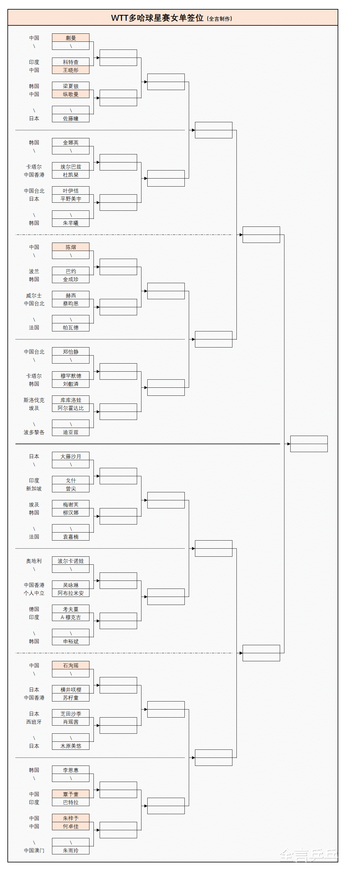 韩国的张禹珍/赵大成、中国台北的林昀儒/郑怡静、印度的巴特拉无疑是国乒严防的对象,至于何卓佳与朱梓予的内战也非常有看点,胜者将与中国澳门世界冠军朱雨玲一较高下,让我们一起静观比赛的新动态吧!