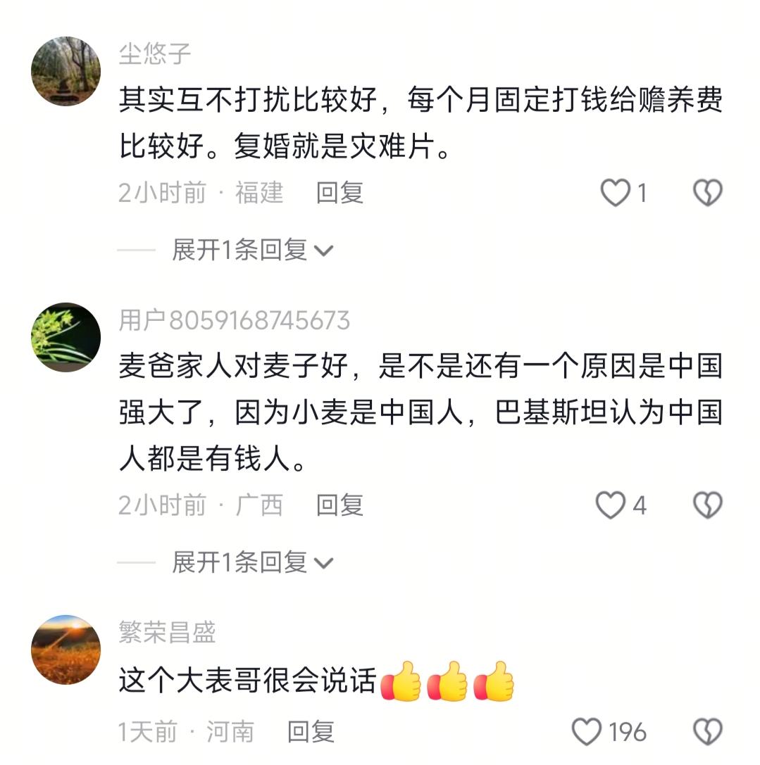 看到麦子说要接他爸回中国,我忍了 看到他还说想撮合他妈妈和爸爸在一起,我也忍不住 可看到他的大表哥说这些强求不得,我再也忍不了了 说真的,最近刷麦子的视频刷到我郁闷死!本来摸鱼想刷个热闹,结果越看越闹心,有没有跟我一样,追个跨国亲情的瓜,追得半夜还在跟网友吵评论的?本来以为是个圆满寻亲故事,结果越看越觉得,这里面的门道真没那么简单。 说实话,我本来是铁站麦子的,连老爸来华的护照都办好了,准备飞巴基斯坦接人,顺便撮合分居多年的爸妈破镜重圆,多完美的孝心剧本啊?结果他找大表哥问计那段,大表哥一开口,我直接哎呀妈呀,太给力了! 之前听人说,凡事有因缘,强求不来,那时候还觉得是佛系废话,现在看可不就是这个理?说真的,我之前也干过这种蠢事,本来想撮合闹分居的小姨和姨夫,天天两头跑着劝,结果俩人没和好,反倒都把我骂了一顿,那时候我还崩溃,觉得自己好心没好报,现在才懂大表哥说的“未经他人苦,莫劝他人善”,真不是胡扯。 大表哥说的太明白,你寻父尽孝、给爸钱改善生活没问题,接来旅游你妈也不会反对,但复合这事,全看俩当事人的意愿,轮不到晚辈站在道德高地上逼逼赖赖,你说是不是这个理? 我晕,评论区真的啥说法都有,给我和小伙伴都惊呆了。有人说老麦就是嘴甜不靠谱,复合就是引狼入室,只能来玩玩不能留下;有人说老麦是无业混子,签证官就该拒了他;还有人说这全是剧本,全家为了涨粉演戏,随便怎么演都行。 老实讲,我一开始也跟着瞎激动,一会骂麦子拎不清,一会骂网友管太宽,但是又怎样?人家接的是自己亲爸,尽的是自己的孝,人家亲妈都没发话,咱们隔着屏幕操什么心呢?之前听人说,各人有各人的因果,咱们连自己的日子都没捋明白,瞎凑什么热闹? 总之,我想说的是,不管是看瓜还是遇着身边的事,别随便站在道德高地上指手画脚,人家的日子人家自己过,咱们看着热闹就得了,别把自己气个半死,不值当的,对吧?麦子回家吃饭 麦子爸爸 麦子事情 麦子合照 麦子父子 麦子直播 麦子寻父 麦子表妹