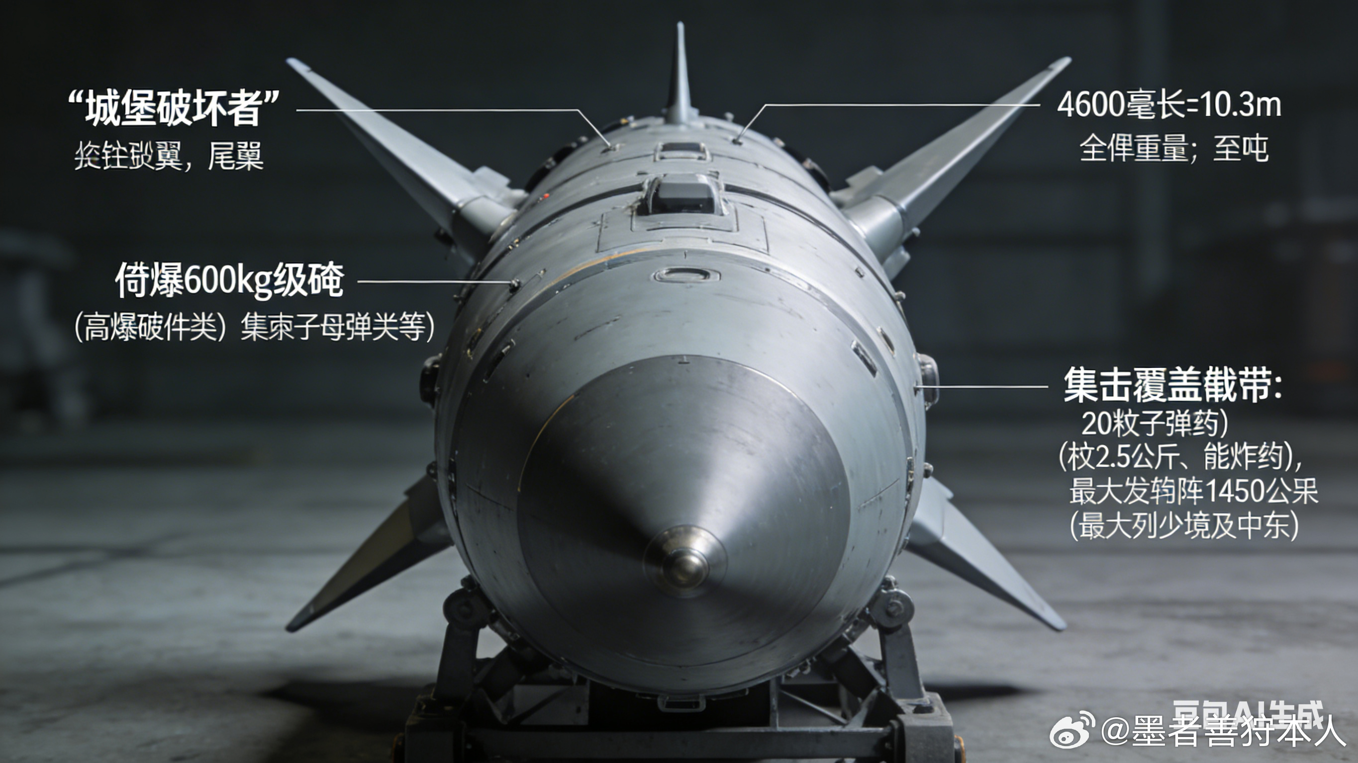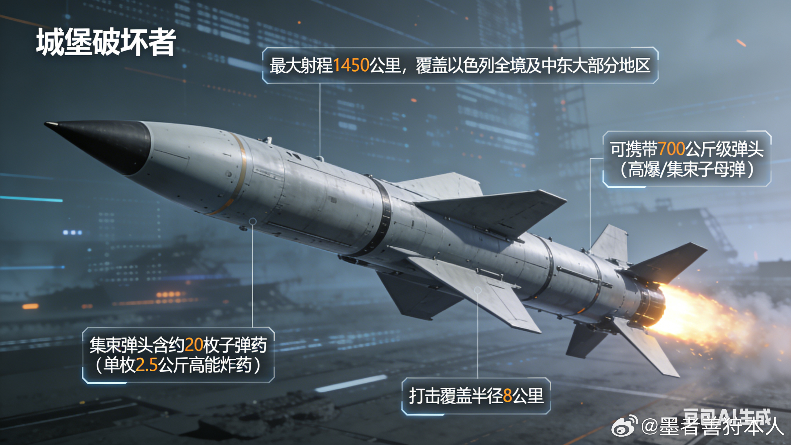 “城堡破坏者”导弹弹体采用鸭式气动布局,弹头为尖锥形,配备控制翼与尾翼,弹体直径约 700 毫米,长度约 10.3 米,全弹重量约 5 至 6 吨,可携带 700 公斤级弹头,包括高爆弹头、集束子母弹头等多种战斗部,其中集束弹头可携带约 20 枚子弹药,单枚子弹药含 2.5 公斤高能炸药,打击覆盖半径达 8 公里,具备较强的面杀伤能力。该导弹配备先进制导系统,具备末端机动变轨能力,可有效规避雷达锁定与防空系统拦截,命中精度较高,2024 年 1 月曾精准摧毁 1200 公里外的目标,2025 年 6 月、2026 年 3 月多次在实战中用于打击以色列境内目标,展现出较强的突防与打击效能。