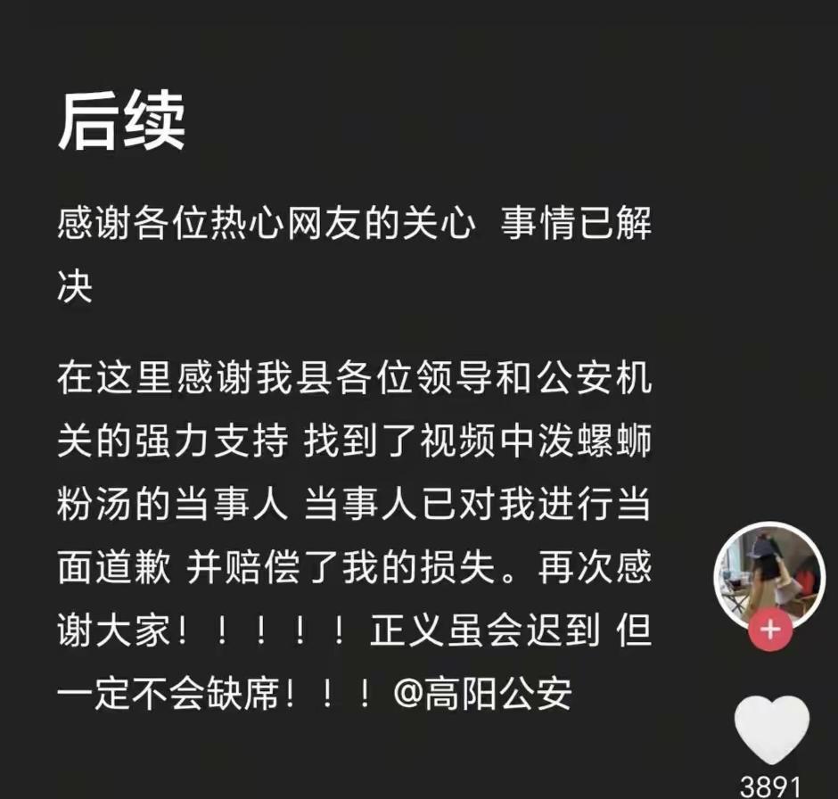 我早就猜到了泼汤女事件会和解,因为说白了就是件羽绒服,大家都是普通人咋可能一直进行追究? 但是多少还是不解气啊,不过我觉得泼汤女的后续没完,她已经为这次泼汤事件付出了惨痛的代价:她失去了名声! 在网络发达的年代彻底社会性死亡了,这跟遗臭万年了有啥区别。 特别是领导同事知道后,谁还敢跟这种人打交道,万一一个不顺心就作妖的,这可不敢想啊。 毕竟这种人随心所欲惯了,稍有不如意就会用小手段害人,只能敬而远之。 受害人说泼汤大姐已经道歉和赔偿了,所以这事结束了,没有那些拘留啥的,因为这件事如果没有发酵,的的确确是件很小的事情。 在帽子叔叔这边看来,和解是最高效解决问题的方式,如果在想要更多就得去上诉了,这实在是吃力不讨好,普通人谁愿意去浪费时间和金钱呢? 大家说是不是?如果是你,你是否也会选择和解呢
