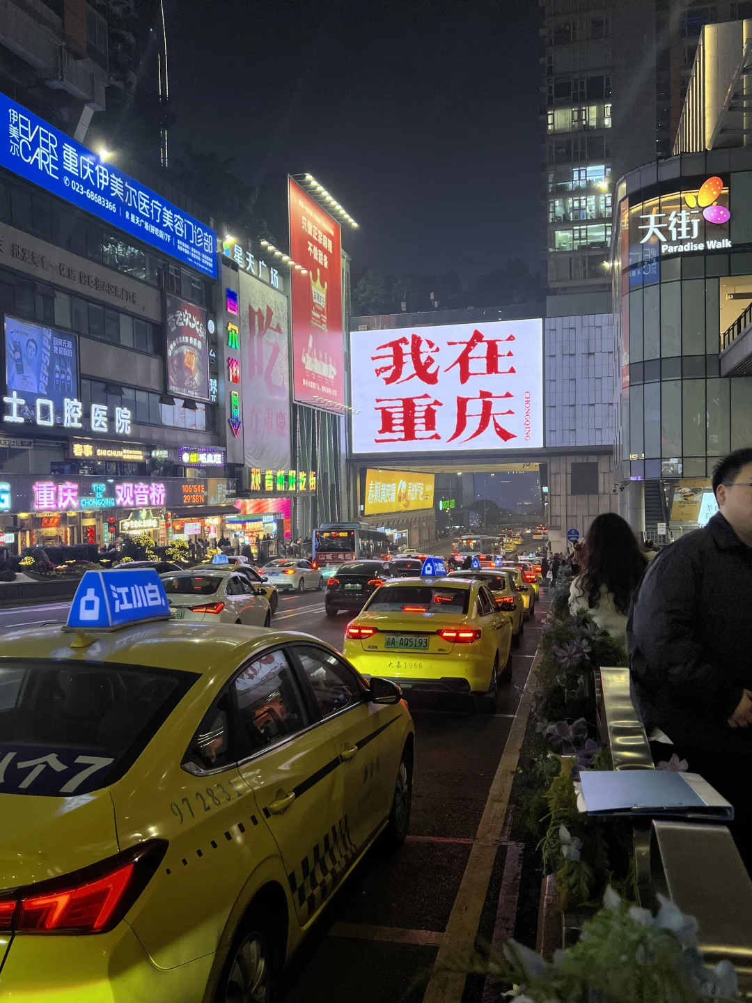 📍观音桥:吃喝玩乐样样俱全,很多人拍“我在重庆”大屏,大概3-5分钟轮一次,而且一次只显示十多秒