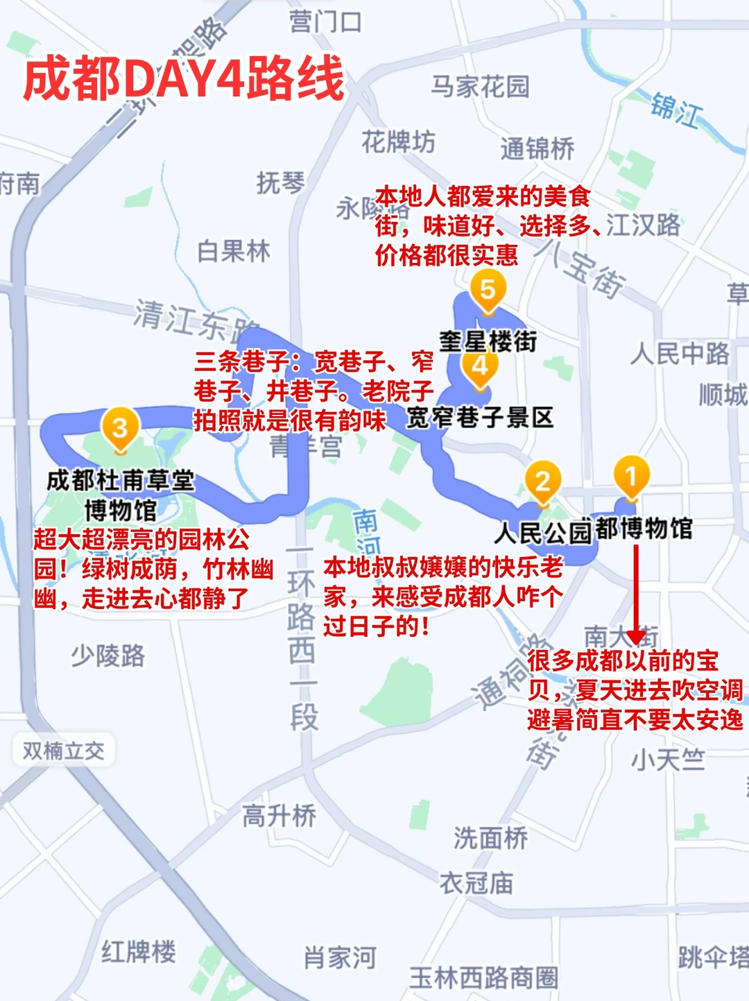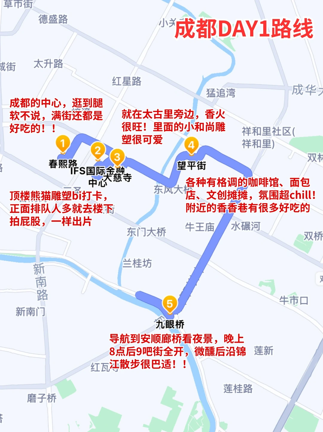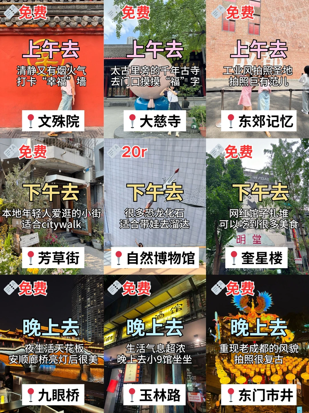 刚去成都玩了3天回来,真的是轻轻松松呀✌️ 虽然是p人,但还是整理了一份详细的成都旅游攻略 姐妹们可以参考参考~ 我觉得已经够全面了😎包你不踩雷 · ✔️轻松版旅游路线 DAY1️⃣:春熙路-国金中心-大慈寺—望平街-九眼桥 DAY2️⃣:熊猫基地-东郊记忆-文殊院-武侯祠-锦里 DAY3️⃣:成都博物馆-人民公园-杜甫草堂-宽窄巷子-奎星楼 · 🍲成都美食分享 🥢烤匠麻辣烤鱼(太古里店) 🥢杨记隆府江湖菜地道川菜(成都总店) 🥢罗妈砂锅 🥢渝少侠·熊猫小院火锅 · 🎁成都特色伴手礼