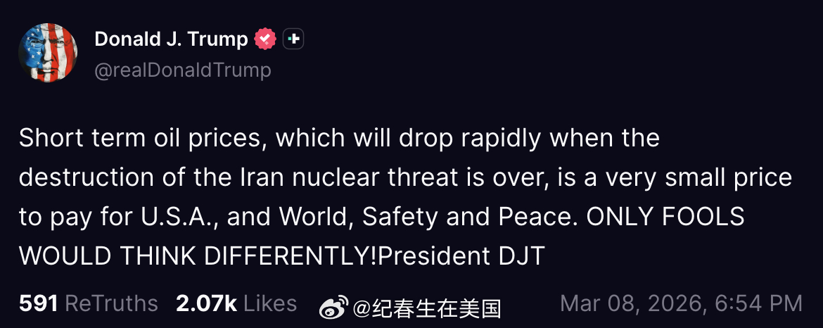 ”短期内油价上涨不算什么。一旦伊朗的核威胁被彻底消除,油价很快就会大幅回落。为了美国以及全世界的安全与和平,这点代价微不足道。只有傻子才想不通!”