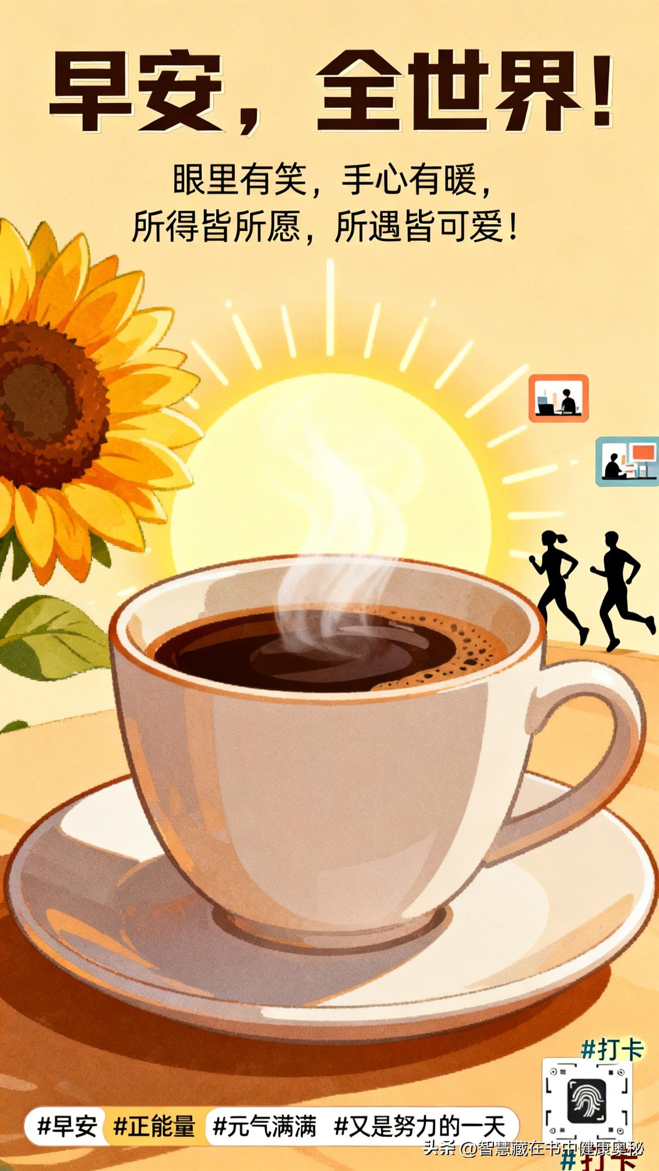 ☕️ 早安,全世界!愿你今天: 眼里有笑,手心有暖, 所得皆所愿,所遇皆可爱! 早安!🌞 活力开启!朋友🌻 既然太阳已经升起,那就没有理由不努力。 让昨天的烦恼清零,让今天的快乐满格! 把汗水留在操场,把专注交给工作,把微笑留给自己。 做一个元气十足的人,去奔赴属于你的星辰大海! 💪 **今日打卡:开心+自律!冲鸭!*
