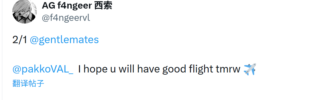 艾特M8主教练pakko(前KC青训教练,与f4ngeer去年一起在KC二队待过),祝你明天坐飞机一路平安啊。"