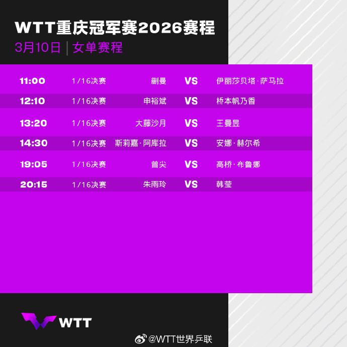 倒计时1天。 山城重庆,乒乓盛宴箭在弦上。 WTT重庆冠军赛明日开赛,国乒首日4场对决率先敲定。 3月10日,国乒全日赛程,一次性晒全! 11:00 T1 蒯曼 VS 萨马拉 这不是两人首次交手。 今年1月多哈冠军赛,蒯曼曾3-0横扫萨马拉晋级。 萨马拉虽过巅峰,但反手韧劲仍在。 蒯曼能否延续优势,避免大意翻船? 11:35 T1 周启豪 VS 黄友政 国乒内战,最是揪心。 同队较量,知根知底,没有秘密可言。 谁能顶住压力,率先闯进下一轮? 13:20 T1 王曼昱 VS 大藤沙月 焦点对决,提前上演。 大藤沙月刚被石洵瑶4-0横扫,状态堪忧。 王曼昱擅长相持,正好克制她快而不狠的打法。 但轻敌从来都是大忌,曼昱能否稳扎稳打? 19:40 T1 温瑞博 VS 科顿 晚间收官战,看点拉满。 温瑞博作为国乒新生代,急需一场胜利证明自己。 科顿打法灵活,擅长突袭,绝非软柿子。 这场青春对决,谁能笑到最后? 本次赛事采用单败淘汰制,首轮五局三胜。 每一场都输不起,每一分都要拼尽全力。 国乒首日四线出击,既有强强对话,也有内战考验。 没有绝对的稳赢,只有全力以赴的拼搏。 明日山城,国乒能否全员开门红? 你最看好哪一场对决,评论区留下你的预测。