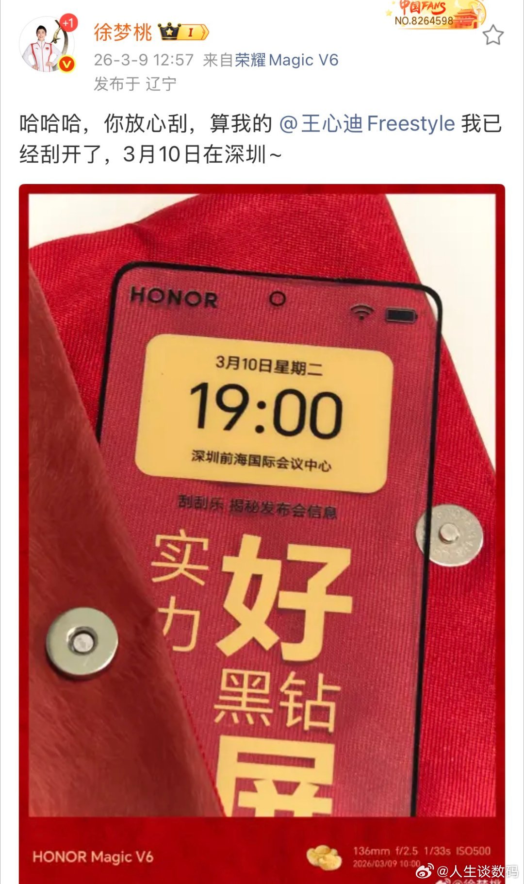荣耀Magic V6徐梦桃王心迪将亮相荣耀发布会荣耀Magic V6发布会太有活了,看这互动的意思是冠军夫妇要合体了,之前看冬奥场边桃子用赤兔红版的荣耀Magic V6,疯狂拍心迪,当时就被一秒种草,这次直接线下冠军夫妻同台,把期待直接顶满。