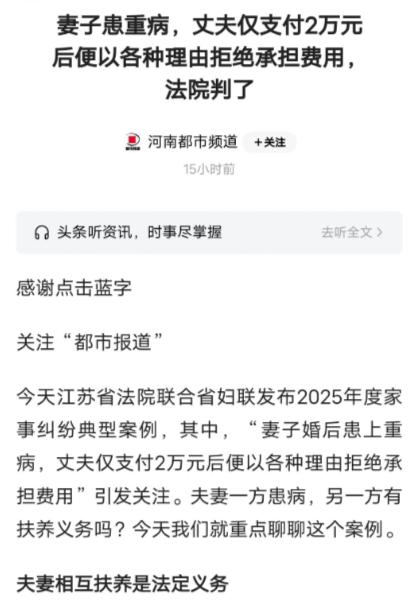 “薄情寡义!”江苏,女子身患重病,左眼失明,右眼视力下降,丈夫却把她送回娘家,让岳母照顾,2年后,女子被诊断脊髓损伤,截瘫,丈夫只给了2万元,借口他要还房贷,要养孩子,还准备起诉要和女子离婚,便再也不给妻子医药费。女子无奈告上法院,法院这样判了。 事情要从女子确诊重病说起,当时她被查出患有视神经脊髓炎谱系疾病,这种病对身体的伤害极大,先是左眼彻底失明,接着右眼视力也急剧下降,连基本的视物都变得困难,更别说照顾自己和家庭了。 丈夫起初还能勉强照料,但随着病情不断加重,女子的生活越来越无法自理,家里的开销也像滚雪球一样越积越多。没过多久,丈夫就以需要照顾为由,把女子送回了她母亲家,从此把照顾的责任全推给了年迈的岳母。 岳母心疼女儿,也知道女婿有难处,便主动承担起照顾女儿的重任。可谁也没想到,这一送出去,就再也没能安稳下来。2024 年 3 月,女子的病情突然恶化,被确诊为脊髓损伤、截瘫,还被评定为多重残疾二级,彻底失去了劳动能力,日常吃喝拉撒都需要人伺候。 这两年多的时间里,她多次就医,光是亲属垫付的医疗费就超过了 10 万元,而丈夫只在初期给了 2 万元,之后就彻底断了联系。 面对岳母的求助和女子的催促,丈夫的态度越来越冷漠。他不仅不再支付医药费,还对外宣称自己要还房贷、要抚养孩子,压力巨大,实在顾不上妻子。更过分的是,他还准备起诉离婚,想以此彻底撇清关系,把所有负担都甩给女子和她的娘家。女子看着自己如今的模样,又想到丈夫的所作所为,心里又寒又痛,她实在走投无路,只能选择通过法律途径维护自己的权益。 法院开庭审理时,丈夫依然坚持自己的说法,称房贷和孩子的开销是大头,自己没有能力再承担妻子的医药费和扶养费。但法院经过仔细审理,最终作出了明确判决。法院认为,夫妻之间有相互扶养的法定义务,这一义务不会因为一方生病、另一方想要离婚而消失。 女子身患重病、丧失劳动能力且生活不能自理,属于法定需要扶养的情形,丈夫在将她送回娘家后,没有充分履行经济供养和生活扶助的义务,行为明显不符合法律规定。 最终,法院结合双方婚后共同生活情况、女子的病情和治疗需求、女子的经济状况,以及丈夫的负担能力、当地平均生活水平等因素,酌情判决丈夫给付女子医疗费和扶养费合计 5 万元。这个判决结果,不仅维护了女子的合法权益,也明确了夫妻间扶养义务的严肃性 —— 哪怕婚姻关系存续期间出现矛盾,哪怕一方有经济压力,也不能以此为借口拒绝履行扶养责任。 这件事之所以引发广泛关注,核心就在于它戳中了很多人对婚姻责任的认知底线。有人说,夫妻本是同林鸟,大难临头各自飞,但这种 “各自飞”,不能突破法律和道德的底线。丈夫以还房贷、养孩子为由推脱责任,看似有苦衷,实则是在逃避自己的义务。房贷和孩子的开销固然重要,但妻子的生命健康和基本生活保障,难道就不重要吗? 对比一些类似案例,我们更能看清责任的重量。比如有的夫妻,一方患病后,另一方即便经济紧张,也会四处借钱凑医药费,哪怕最终离婚,也会尽力承担起治疗期间的费用。而本案中的丈夫,不仅在妻子病重时将其送回娘家,还在妻子截瘫后彻底断供,甚至想以离婚撇清责任,这种行为,既违背了《民法典》中关于夫妻扶养义务的规定,也违背了基本的人伦道德。 从道德层面来说,婚姻的本质是相互扶持、彼此陪伴。两个人走到一起,本就是为了在人生的风雨中相互照应。当一方遭遇病痛打击,最需要的就是另一方的理解和支持,而不是被抛弃、被推诿。丈夫的行为,不仅让妻子寒心,也让整个社会对婚姻的信任打了折扣。如果连夫妻之间都无法做到患难与共,那么所谓的 “责任”“承诺”,就都成了空话。 当然,也有人会问,面对巨额医药费和沉重的照顾负担,丈夫确实有压力该怎么办?但压力和责任从来不是对立的。有压力可以寻求社会帮助,可以和家人共同协商,但不能以压力为借口,彻底放弃自己的义务。比如可以和岳父母共同分担照顾责任,可以合理规划家庭开支,也可以通过合法途径寻求社会救助,而不是一走了之、一断了之。 这件事也给我们提了个醒,在婚姻关系中,既要懂得珍惜,也要懂得坚守法律和道德的底线。同时,对于身处困境的人来说,要学会勇敢地拿起法律武器维护自己的合法权益,不要因为害怕麻烦或顾及情面,就默默承受不公。法院的判决,不仅是对这名女子的补偿,更是对所有夫妻的提醒:夫妻之间,扶养义务重于山,不可轻言放弃。 婚姻从来不是一场只享权利、不担义务的交易,而是一份需要坚守、需要担当的责任。当我们在婚姻中遇到风雨时,是选择携手同行,还是选择转身逃离,不仅决定着一段婚姻的走向,更彰显着一个人的品格和底线。 你觉得在婚姻中,夫妻间的扶养义务还应该包含哪些内容?如果遇到类似情况,你会如何选择?欢迎在评论区分享你的看法。