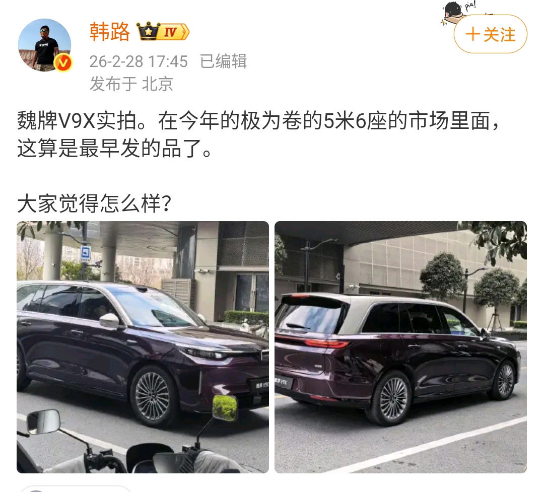 韩路:魏牌V9X实拍。在今年的极为卷的5米6座的市场里面,这算是最早发的品了。大家觉得怎么样?