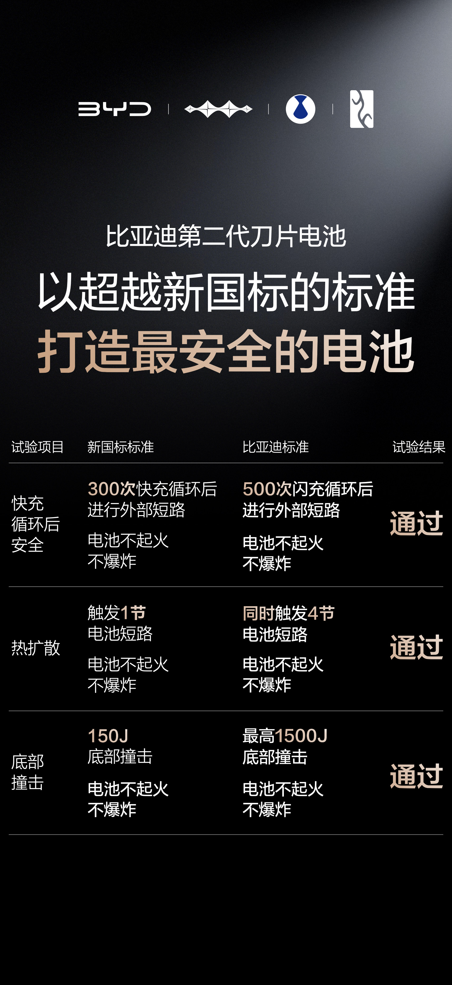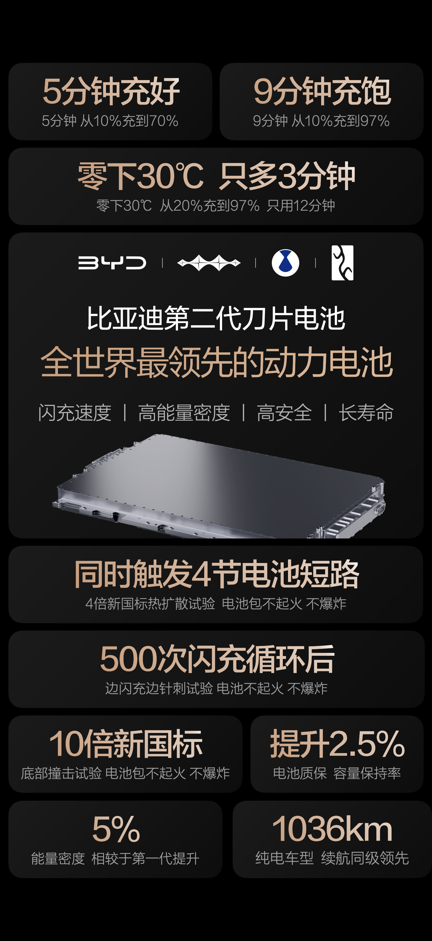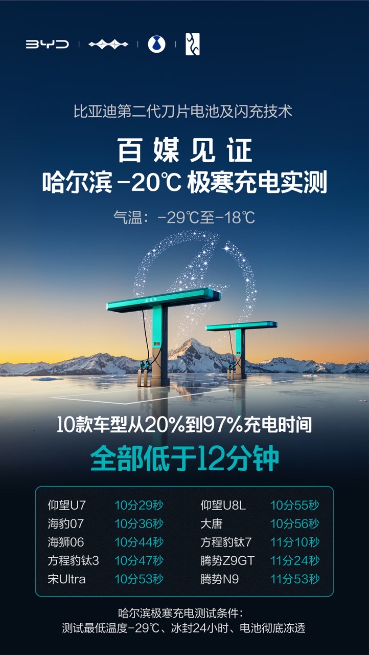在充电性能方面,第二代刀片电池常温下可实现5分钟充满、9分钟完全充满;即便在零下30摄氏度的极低温环境下,充电时间也仅增加3分钟,全面提升全温域补能效率。安全层面,该电池通过了包括500次闪充循环后边充边针刺、4节电池热扩散、10倍于国标的底部撞击等极端测试,在全生命周期内均保持高稳定性。