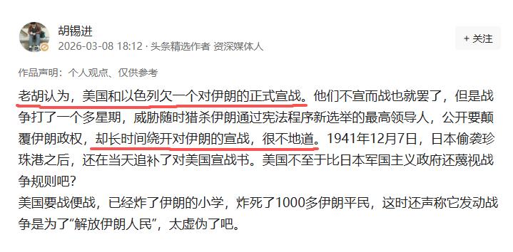 胡锡进说,美国打伊朗之前没有进行“宣战”,这“很不地道”,美国不仅突然发动了对伊朗的袭击,还突然杀死了伊朗的领导人,至今仍未履行宣战程序,他举例说,1941年12月7日,日本偷袭珍珠港之后,还在当天追补了对美国宣战书。美国不该如此蔑视战争规则。 对于老胡的观点,网友立马进行了反驳,一个最明显的例子,俄罗斯打乌克兰,宣战了吗?也没有。当时,俄方以“特别军事行动”之名突然开展行动,并没有正式宣战,但这并不意味着其行动缺乏某种“合理性”依据或国际政治考量。 再看看历史,不宣而战的战争多了。 1900 年八国联军侵华,以“保护使馆”和“镇压义和团”为借口,直接出兵中国,并未对中国正式宣战。 又如中日甲午战争,日本也是不宣而战,在朝鲜丰岛海面突然袭击了增援朝鲜的清朝军舰,随后战争爆发。 再说九一八事变和七七事变,日本都是随便编了个理由就发起战争,哪里有宣战? 美国攻击伊朗当然是不正义的,但是这跟宣战不宣战并没有太大关系。 宣战与否并不能直接衡量一场军事行动的正义性或“地道”程度。判断美国对伊朗行动的性质,应综合考量其行动的实质影响、是否违反国际法以及背后的真实动机等多方面因素。